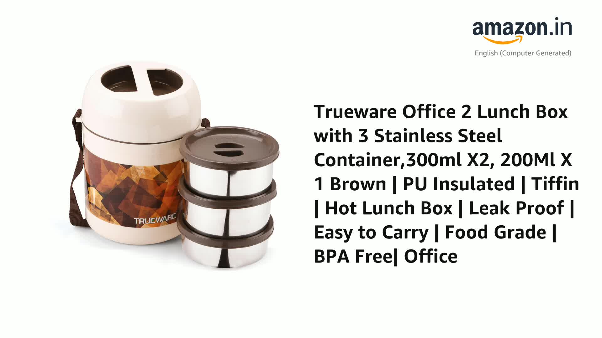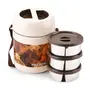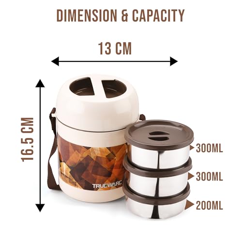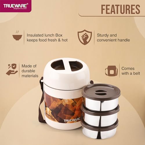 Trueware Office 2 Lunch Box with 3 Stainless Steel Container,300ml X2, 200Ml X 1 Brown | PU Insulated | Tiffin | Hot Lunch Box | Leak Proof | Easy to Carry | Food Grade | BPA Free| Office