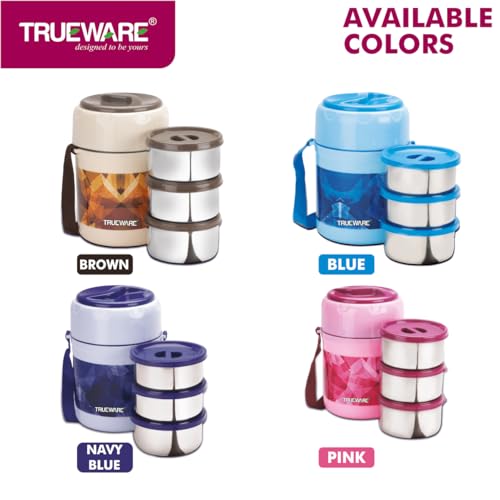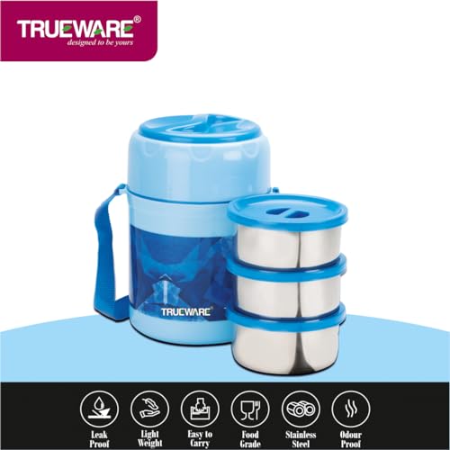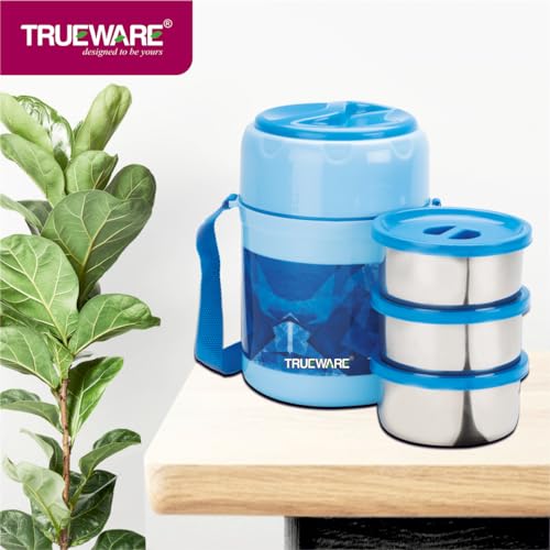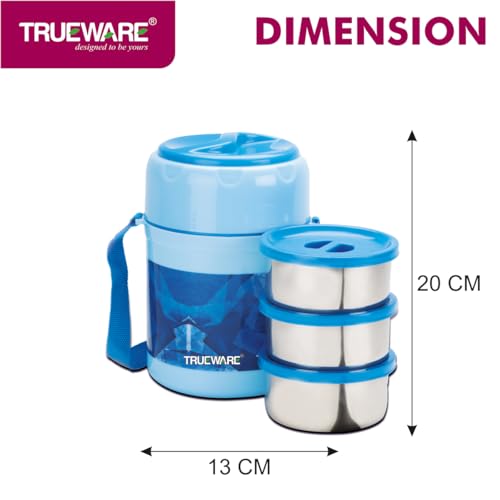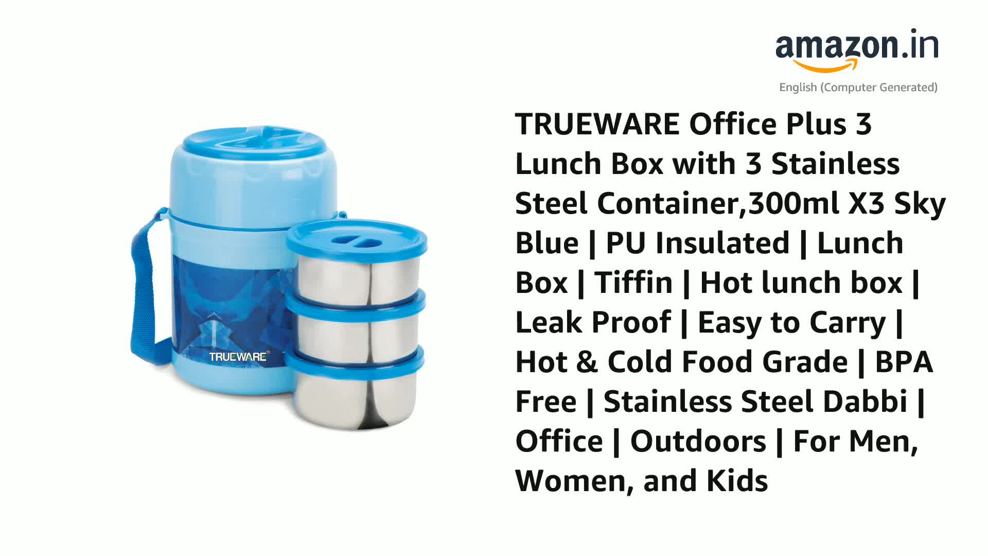 TRUEWARE Office Plus 3 Lunch Box with3 Container300ml X3 . Color- Sky Blue -Experience the ultimate lunchtime convenience with the Trueware Lunch box. Designed to cater to the needs of office-goers students and homemakers this versatile lunch box is perfect for men women and kids alike. Crafted from durable stainless steel the Trueware Lunch box ensures long-lasting performance. Its insulated design keeps your food at the desired temperature whether it's a steaming hot curry or a refreshing chilled salad. No more settling for lukewarm meals or soggy sandwiches! With its spacious compartments and curry container this lunch box provides ample storage for a variety of dishes. Pack your favorite meals snacks and sides while keeping them organized and leakproof. The included juice bottle is an added bonus allowing you to quench your thirst on the go. Worried about reheating your food? Fear not! The Trueware Lunch box is microwave safe making it convenient and hassle-free. Simply pop it into the microwave heat your meal and enjoy piping hot food in an instant. Ideal for students the Trueware Lunch box is a favorite among college-goers. Its modern design and easy-to-carry features make it a stylish and practical choice. Plus it's the perfect companion for long study sessions or on-campus lunch breaks.
