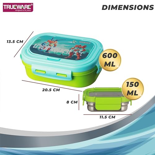 Trueware POKO Junior Steel Lee Pu Insulated Hot Lunch Box 600ML Big Container and 150 ML Veggie Container | BPA Free | Food Grade | Keep Food hot for Long Hours | Perfect for School (Green)
