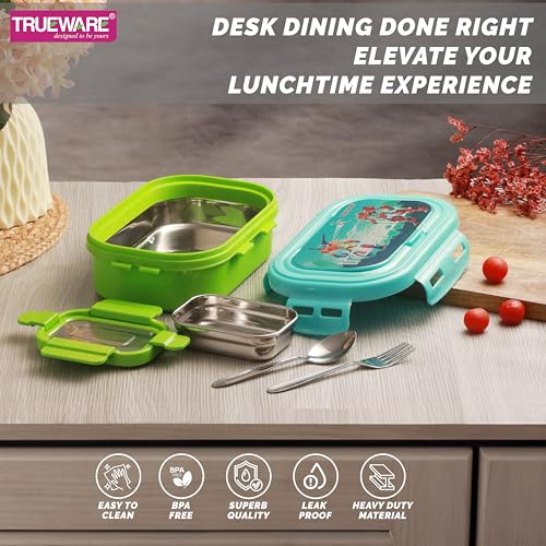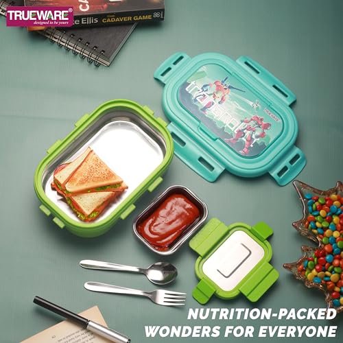 Trueware present POKO Stee-Lee Lunch Box. New Complete veggie container with both inside and outside steel. Keep Food hot for long hours. Perfect for school going Kids and office. Made in India. Attractive Design. Drip Lock High Quality Stailess Steel BPA Free Food Grade FDA Certified Keep Food Hot for Long Time Leak Proof Container for Dry and Wet Food Air Tight Double Wall Pu Insulated 1 Big Container & 1 Veggie Container and 1 Stainless Steel Spoon and 1 Stainless Steel Fork Hot and Cold Easy to Clean Made in india Stainless Steel Inner Silicon Seal Backpack compatible Spill leak-proof design 4 Sided Drip lock Insulated Lunch Box attractive designs 1 Stainless Steel Spoon and 1 Stainless Steel Fork included.
