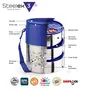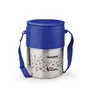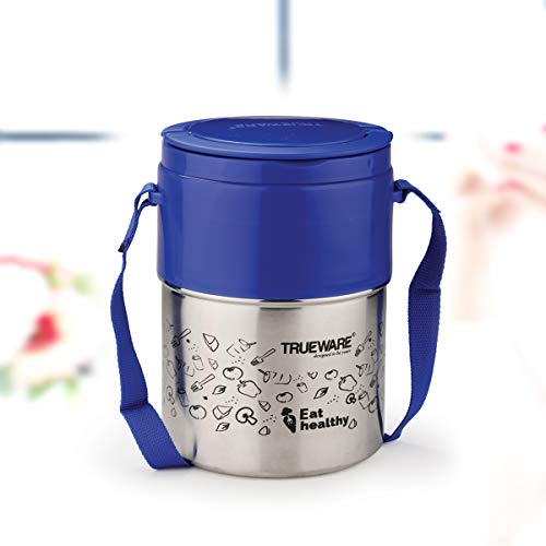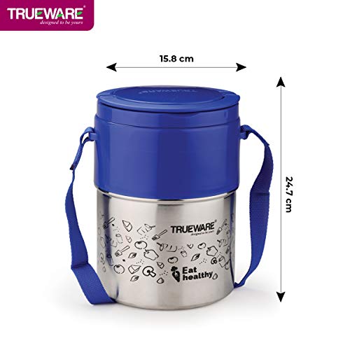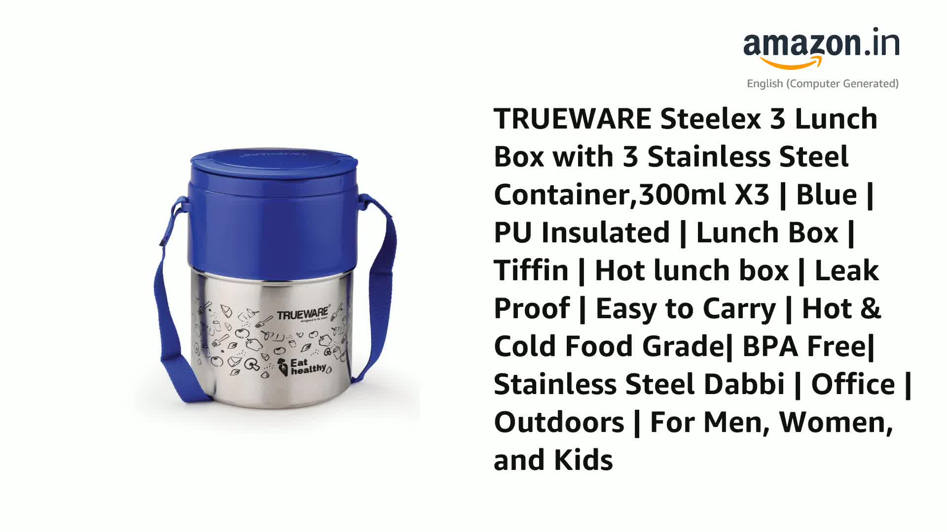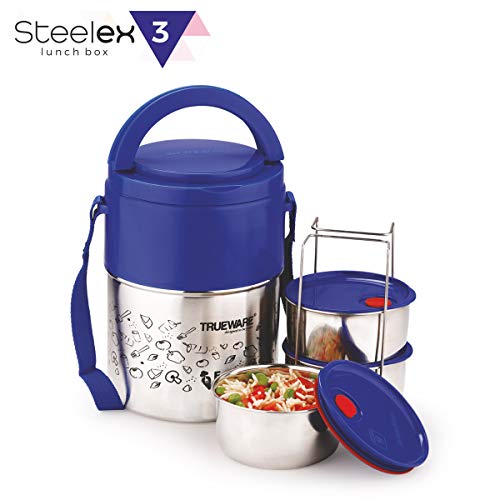 Trueware Steelex 3 Lunch box is made of double wall Polyurethane insulated Stainless Steel Containers. It helps to keep your meal hot and fresh for hours. Three durable Stainless Steel containers with Plastic (BPA free & FDA Approved ) Spill proof air vent cap. Air vent button on container lid helps in releasing air or steam for easy opening of container. This set is perfect for carrying all types of food items including curries rice chapatti sabzi etc. This Lunch Box comes with an integrated handle and carry belt which gives convenience to consumer for handling the product.