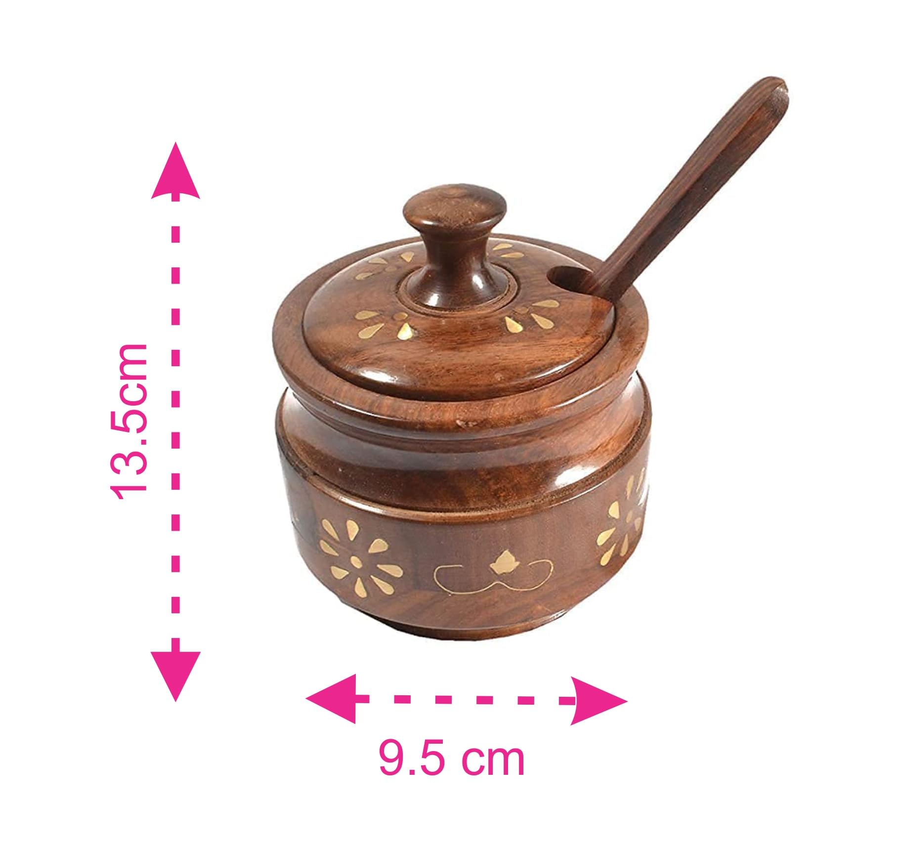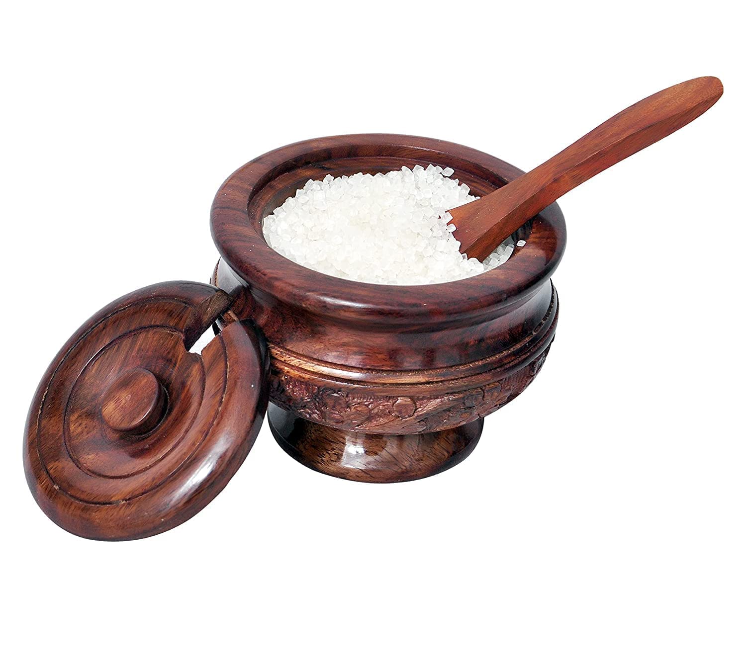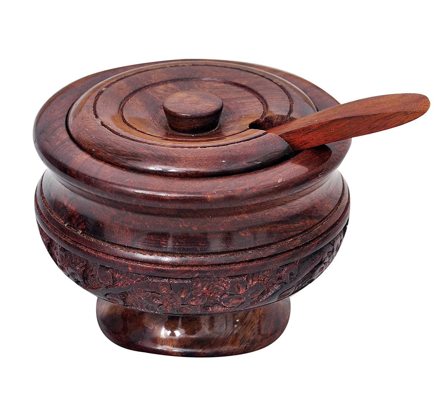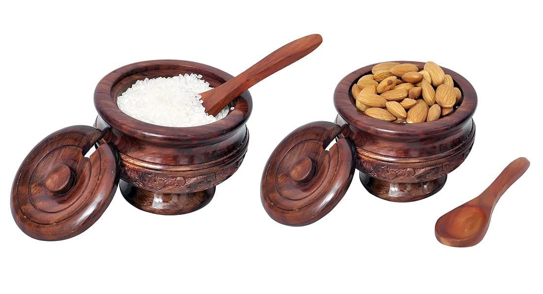 Wooden Sugar / Salt / Spices Bowl with Lid and Spoon which gives Royal Look to your Table. Can be used for Gifting Purposes as well.tested and healthy food-safe top-coat protects the wood from natural decay and dry-wood termites and the surface is covered with premium quality food-safe polish without adding any chemical which makes it hygienic and food safe. Quality is long-lasting as every single product has passed various quality checksWood & Design:- Sheesham Wood with Carving Design Handicrafts Works Use it for:- Keep Sugar Salt Spice Pickle Jar Jam & Multi use PotJarPickle Jar Jam Jar & Multi use Pot Jar for Kitchen & Dining & Multipurpose use Gift Ideal:- Best Gifts for Housewarming & Anniversary Parties