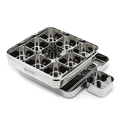 Coconut is range of innovative and quality products for Home and Kitchen.The Square masala Spice Box with SS Lid is made from 100% Stainless Steel. This masala spice box comes with 9 individual compartment containers for convenient handling and easy to use. This masala box is rust proof and hygienic product. Product Content: Coconut Stainless Steel Junior Square Masala Spice Box with SS Lid with 9 Containers. Product Dimension - Width -22Cm Height - 6.5Cm Capacity - 100ML Each Containers.