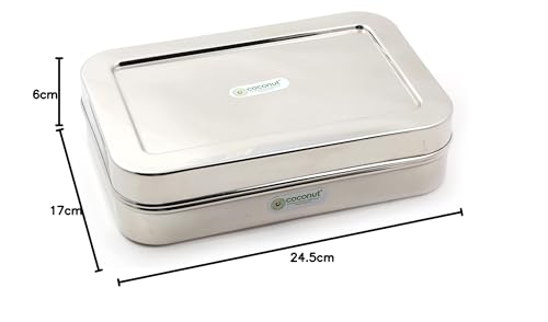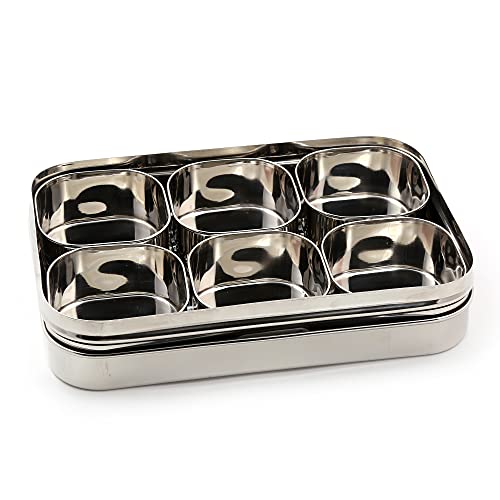 Coconut is range of innovative and quality products for Home and Kitchen.The Square masala Spice Box with SS Lid is made from 100% Stainless Steel. This masala spice box comes with 6 individual compartment containers for convenient handling and easy to use. This masala box is rust proof and hygienic product. Product Content: Coconut Stainless Steel Rectangle Masala Spice Box with SS Lid with 6 Containers. Product Dimension - Width -24.5CM Length - 17CM Height -6 CM Capacity - 150ML Each Containers.