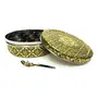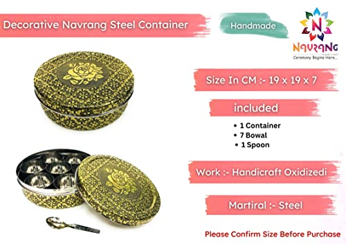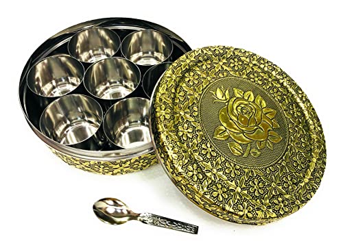 An Decorative and traditional design spice box is been diligently made by proficient artisans using various traditional techniques. Royal Designer spice box or masala dabba are perfect for Gift on Anniversary Marriage Wedding Favors Diwali house warming festive occasions also Return Gifting to loved ones make there celebrations memorable. This stainless steel spice box has 7 containers 1 spoon and lid on top of it. Made from 100 percent food grade stainless steel making it highly durable and resistance to corrosion.You will feel immense pleasure seeing the masala box adding value to your home decor or office table.Gift it to your loved ones to unwrap their beautiful smile and make them feel special.