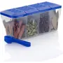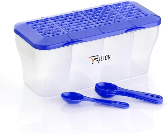 HomeKitchenContainersSpice BoxesRILION Multipurpose Plastic 4 In 1 Masala Box for Kitchen, Spice Boxes for Kitchen, Transparent 4 Compartment Storage Containers Airtight Grocery,Cereal,Dry Fruits Dabba 1800 Ml with 4 Spoons(Blue)