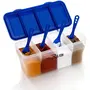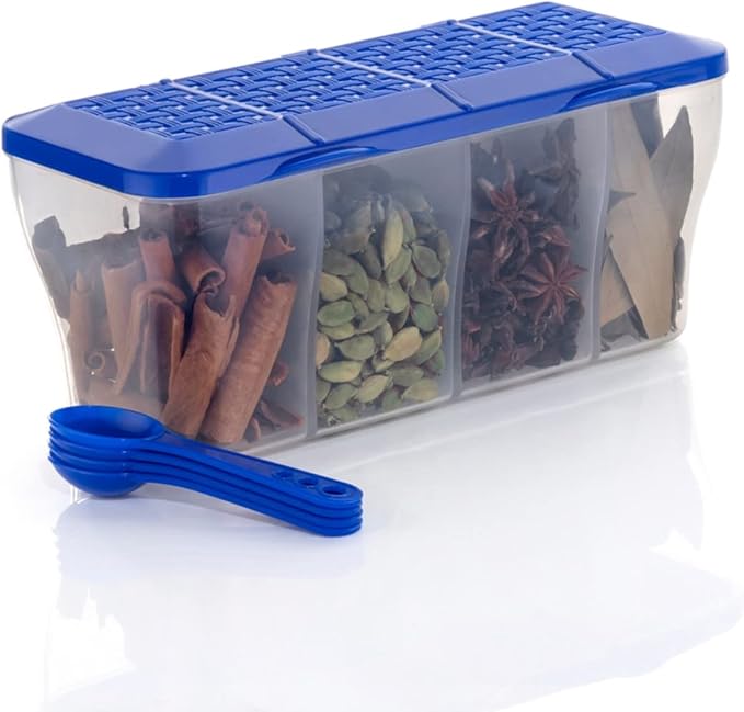 RILION Multipurpose Plastic 4 In 1 Masala Box for Kitchen, Spice Boxes for Kitchen, Transparent 4 Compartment Storage Containers Airtight Grocery,Cereal,Dry Fruits Dabba 1800 Ml with 4 Spoons(Blue)