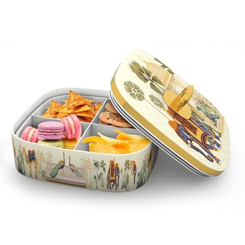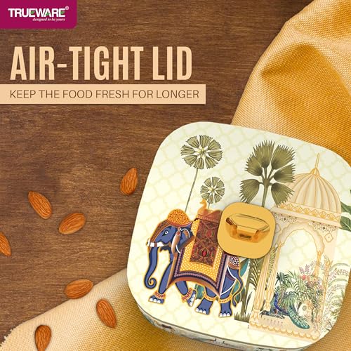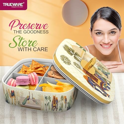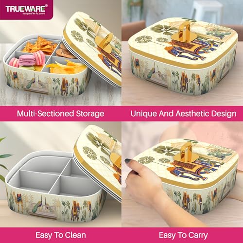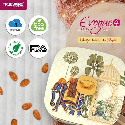 Trueware Present EVOGUE Luxury Serving and Gift Set. Total Capacity 1400 ML Each Compartment 350 ML. Multi-Sectioned Storage Unieque and Attactive Design Easy to Clean Easy to Carry. Air tight lid Keep the food fresh for longer. BPA Free 100% Food Grade. FDA Certified.