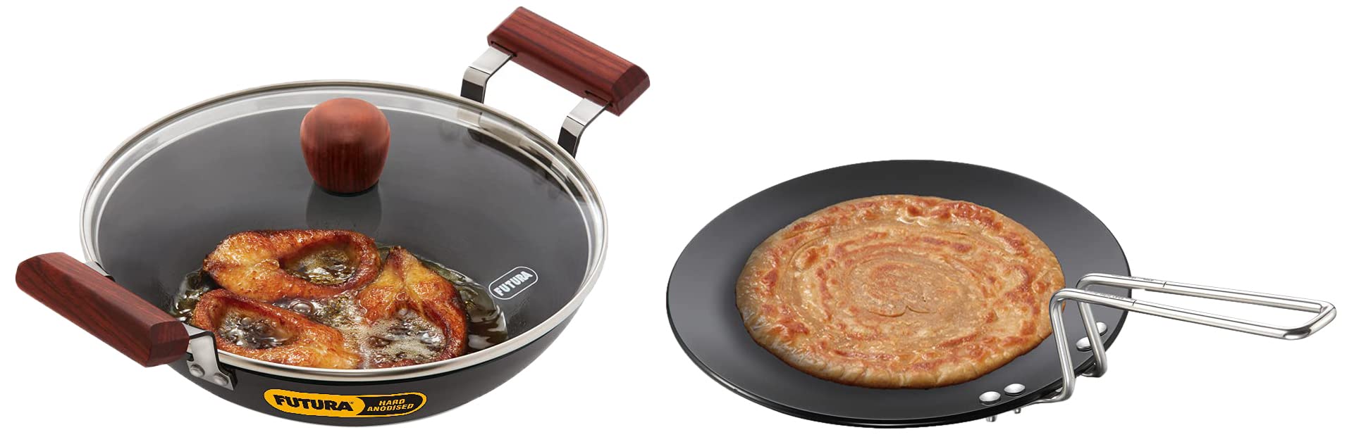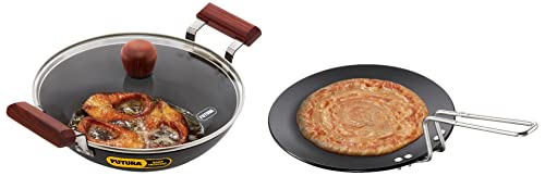 Hawkins - L-59 Futura Hard Anodised Tawa 28cm BlackFutura Hard Anodised Tava are particularly preferred for their heavy gauge and well-balanced pans that make cooking easy and the results delicious. The handles whether in stainless steel or plastic are stay-cool and comfortable. Tava are widely used to cook roti (flatbreads) phulka (puffed unleavened bread) and paratha (layered unleavened bread) all staple foods in India. Tava can also well cook cutlets eggs pancakes French toasts griddle cakes and the like.Hawkins Futura Hard Anodised Aluminium Deep Fry Pan(Fish-Fry Kadhai ) 2.5 litres Black (AFFK25G)This pan has a round bottom for greater convenience during stir-frying. The kadhai comes with a tough heat-resistant glass lid with strong stainless steel rim. Healthy and tasty cooking becomes easy and quick with this Futura Hard Anodized Deep-Fry Pan from Hawkins. Constructed from high quality aluminium this pan ensures even distribution of heat throughout the surface. Designed with a non-induction base this pan is ideal for use on gas stoves. Use the sturdy lid to cover and retain the warmth of food. All Futura hard anodised deep-fry pans are distinguished by elegant comfortable rosewood handles fixed on sturdy stainless steel brackets which are permanently riveted to the pans. All have curved sides suitable for deep-frying and stir-frying.
