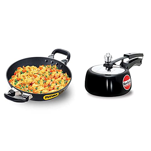 Hawkins Futura Nonstick Deep-Fry Pan (Kadhai Round Bottom) Capacity 1.5 Litre Diameter 22 cm Thickness 3.25 mm Black (NK15)+Hawkins Contura Hard Anodised Aluminium Pressure Cooker 1.5 Liters B