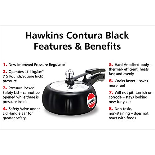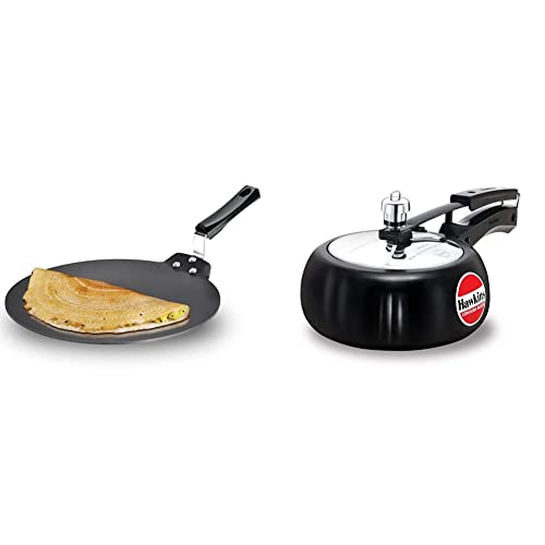 Hawkins Contura Hard Anodised Aluminium Pressure Cooker 2 Liters BlackIdeal for cooking for: 2-3 Persons Base flat diameter: 134 mm Base thickness: 3.25 mm Carton dimensions (WxDxH): 342 x 203 x 138 mm Product weight in carton: 1.73 kgHawkins Contura’s anodised pressure cooker is a cooker that comes with all the benefits of a regular Hawkins Contura pressure cooker with the added benefits of having a hard anodised body. This cooker has 60 micron thick hard anodising which makes it strong and durable enabling it to give you many years of good service. Apart from this the cooker has an impressive black finish. Its hard anodising makes it absorb heat much faster and better than other cookers which in turn helps you save on gas. Because of this the Hawkins Contura’s hard anodised cooker is highly recommended for use on gas stoves. The hard anodised body of this cooker is non-reactive to any food items that might be cooked in it. This ensures that your food is safe to consume. This cooker comes with a stainless-steel lid and has black plastic covered handles. These handles help you handle the cooker without any problem even when it is very hot. The capacity of this Hawkins pressure cooker is 2L which makes it ideal when you’re cooking food for 2 - 3 persons. It has a base flat diameter of 134 mm and a base thickness of 3.25 mm. The cooker also comes with a five year . The outer body of the cooker is black while its lid is silver in colour. Product Features: Has a hard anodised body with a stainless steel lid. Has a glossy black finish. Comes with a five year . Helps save fuel as it absorbs heat very fast.Hawkins - Q28 Futura Non-stick Dosa Tava 28 cm BlackThe Dosa Tava is designed with just the right curvature and thickness to give you the best cooking results when making dosa (rice and gram pancakes). The flange which firmly attaches the handle with strong stainless steel rivets is uniquely designed to not interfere with the cooking surface and to hence maximise the cooking area allowing you to make a very large dosa or several uttapam or cutlets at one time. The 4.88 mm extra thick heavy gauge metal ensures fast and even heat conduction and retains heat well. The Dosa Tava Instruction Manual has 11 tested recipes for the Dosa Tava including four varieties of dosa uttapam cutlets and rolls. The Dosa Tava is suitable for domestic gas and radiant electric cooktops. Diameter (cm): 28 Thickness (mm): 4.88 Carton dimensions (WxDxH): 443 x 286 x 72 mm Product weight in carton: 1.06 kg