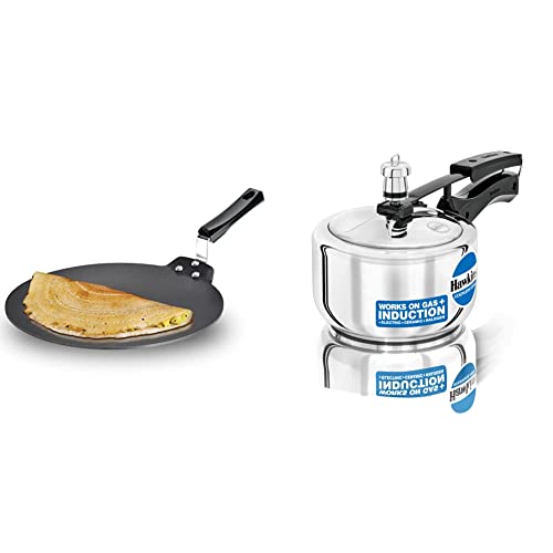 Hawkins Stainless Steel Pressure Cooker 1.5 Litres Silver (HSS15)The body and lid are 100 percent stainless steel. To ensure uniform heating the bottom has a core of 4.06 mm thick aluminium sandwiched between two sheets of stainless steel. The base always stays flat never bulges. Stainless steel stays bright does not pit or corrode is easy to clean and extremely hygienic. Can be used safely for light and deep frying and pressure cooking. Suitable for gas induction electric ceramic and halogen cooktops.Hawkins - Q28 Futura Non-stick Dosa Tava 28 cm BlackThe Dosa Tava is designed with just the right curvature and thickness to give you the best cooking results when making dosa (rice and gram pancakes). The flange which firmly attaches the handle with strong stainless steel rivets is uniquely designed to not interfere with the cooking surface and to hence maximise the cooking area allowing you to make a very large dosa or several uttapam or cutlets at one time. The 4.88 mm extra thick heavy gauge metal ensures fast and even heat conduction and retains heat well. The Dosa Tava Instruction Manual has 11 tested recipes for the Dosa Tava including four varieties of dosa uttapam cutlets and rolls. The Dosa Tava is suitable for domestic gas and radiant electric cooktops. Diameter (cm): 28 Thickness (mm): 4.88 Carton dimensions (WxDxH): 443 x 286 x 72 mm Product weight in carton: 1.06 kg