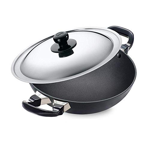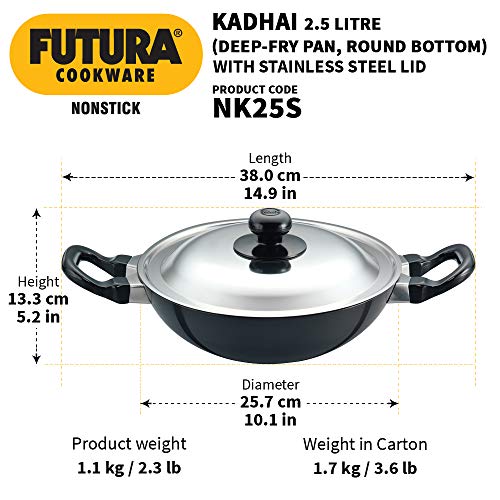Hawkins - Q55 Futura Non-Stick Round Bottom Deep-Fry Pan with Steel Lid 2.5 LitreAll Futura Hard Anodised Deep-Fry Pans are distinguished by elegant comfortable rosewood handles fixed on sturdy stainless steel brackets which are permanently rivetted to the pans. All (except the smallest pan) have a flat bottom for stability. All have curved sides suitable for deep-frying and stir-frying.Hawkins Futura Non-Stick Frying Pan with Steel Lid 22cmApart from the frying pan with rounded sides and extra height this range also has the Futura Nonstick All-Purpose Pans which are deeper and can be used for sautéing stir-frying and deep-frying in addition to their use as a frying pan. The All-Purpose Pan comes with a single long handle and in a larger capacity with two short handles. Both All-Purpose Pans have snug-fit dome-shaped lids which are suitable for simmering and the All-Purpose Pan with two short handles makes an elegant serving bowl as well.