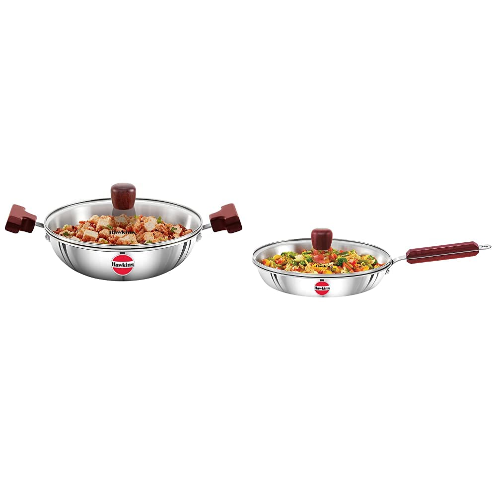 Hawkins Tri-Ply Stainless Steel Induction Compatible Deep-Fry Pan with Glass Lid Capacity 1.5 Litre Diameter 22 cm Thickness 3 mm Silver (SSD15G)+Hawkins Tri-Ply Stainless Steel Induction Compati
