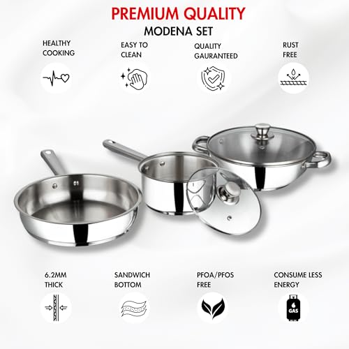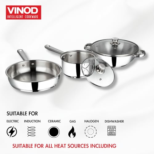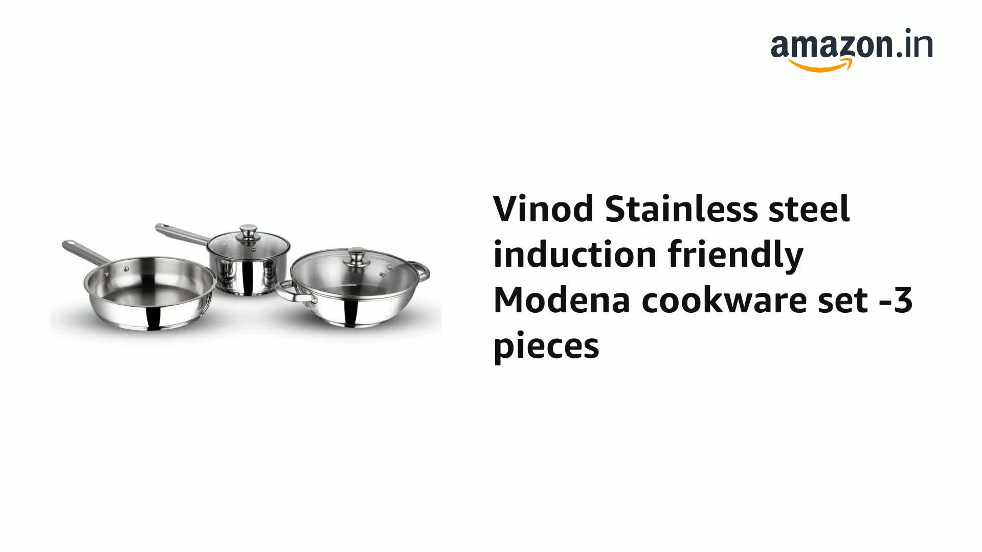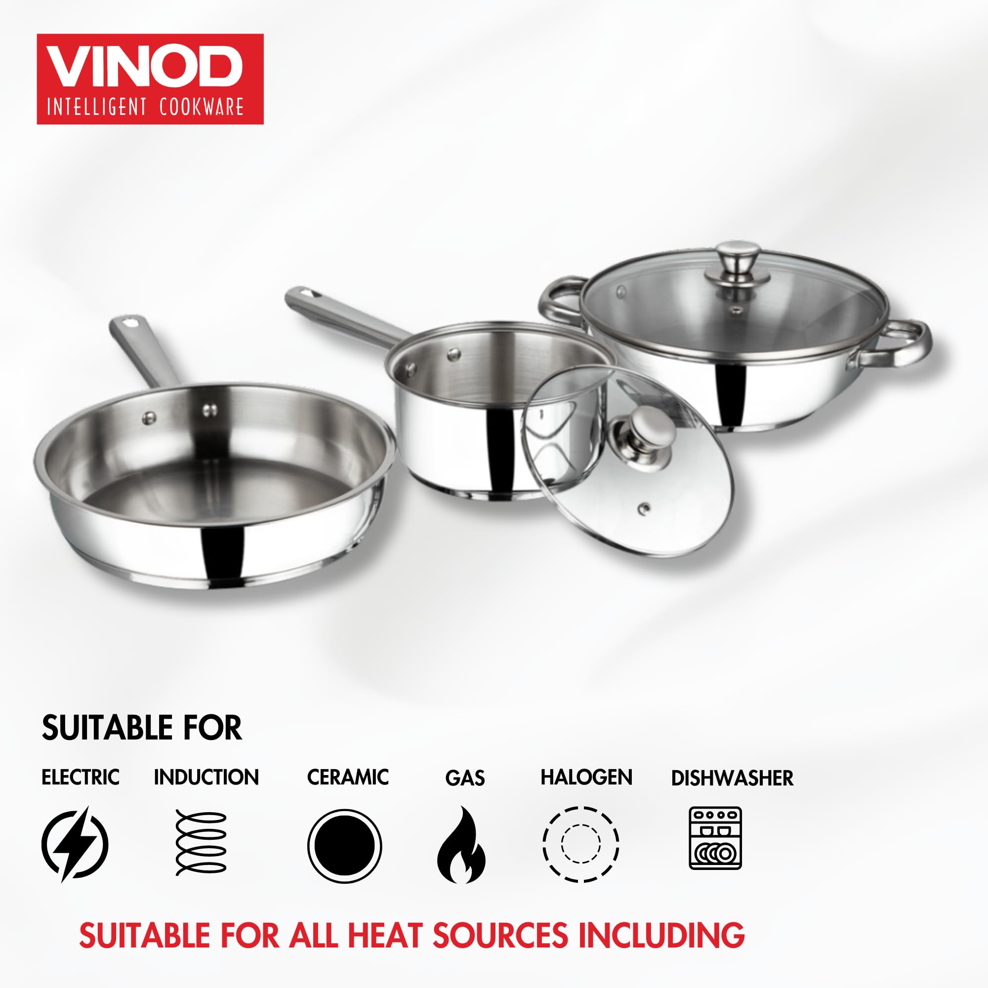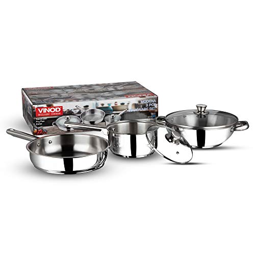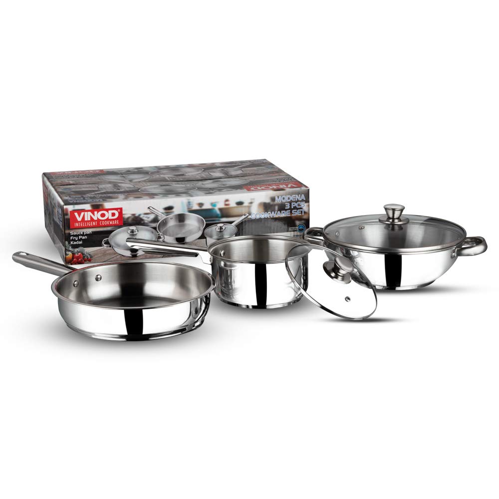 Vinod 3 pc Modena stainless stainless induction based cookware is GO TO set for all your meals whether it is to boil Milk for breakfast in 1.5ltr saucepan that comes with glass lid or cook your favourite lunch in 2.8ltr Kadai with glass lid or simply toss a aloo tikki or eggs for your evening snack in our 24cm frypan.They are made from food grade high quality stainless steel using thicker stainless steel for longer use. To ensure you uniform and faster cooking we have used a layer of aluminium at the bottom. We use a base of stainless steel of Grade AISI 430 grade. This is magnetic and allows you to use your induction cooktop.The mirror finish of the body and the stainless steel layer at the bottom stays bright and looks as good as new after years of use. It also makes the saucepot easy to clean and hassle free. They come with riveted stay cool handles which allow you to work with them effortlessly.
