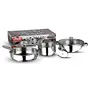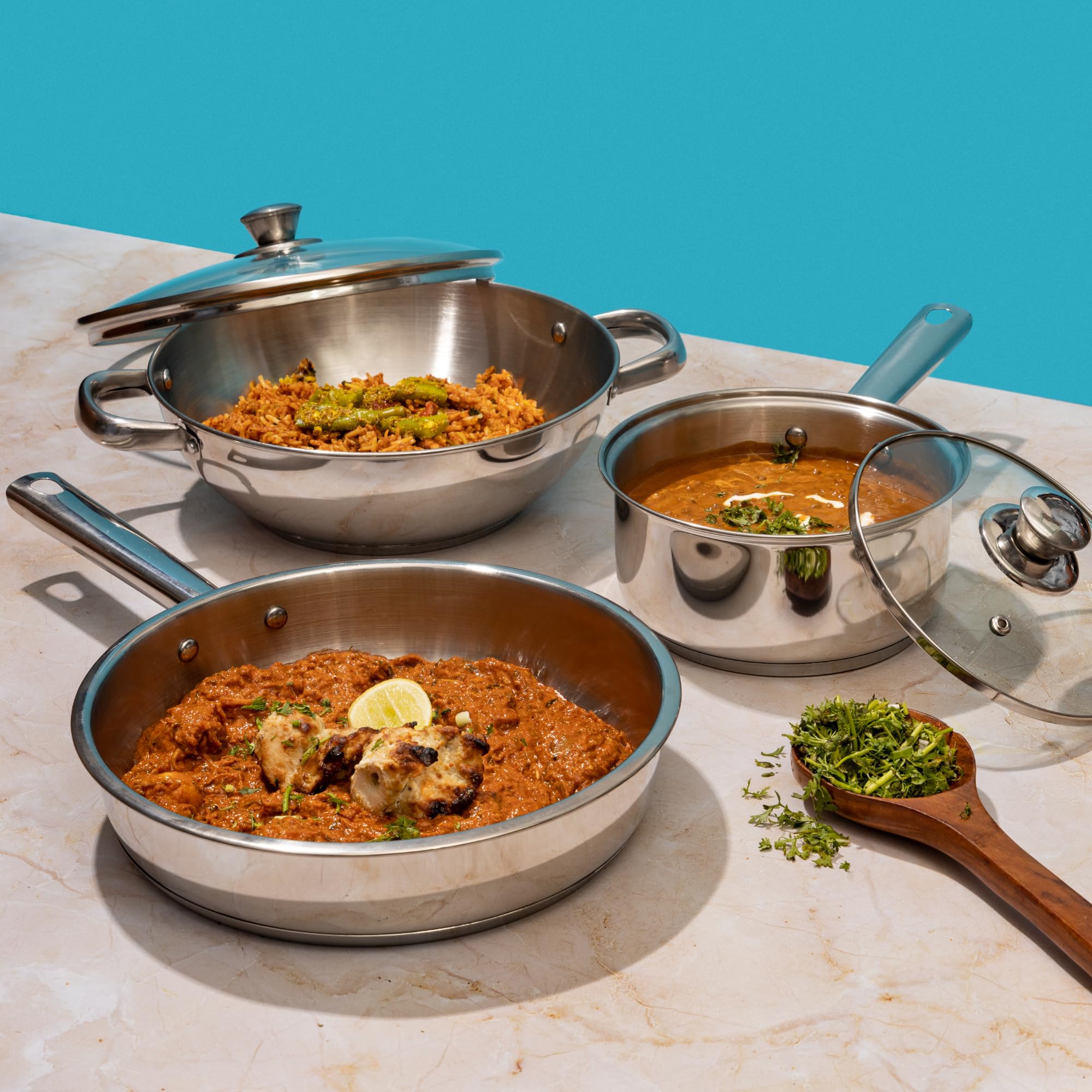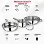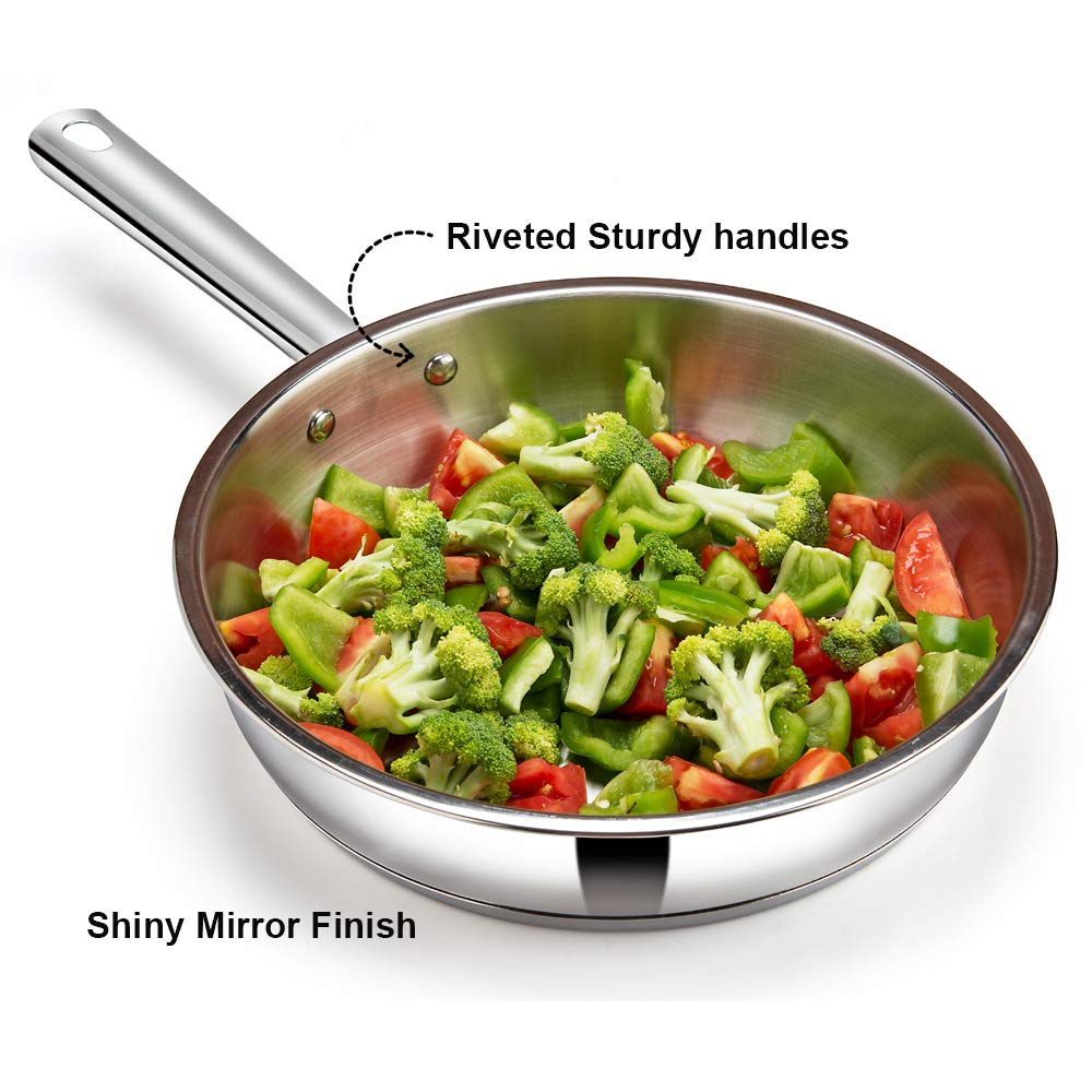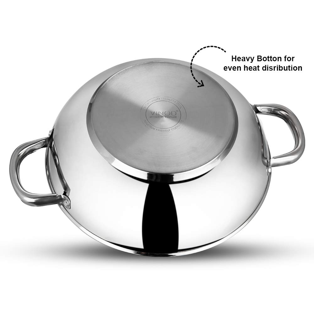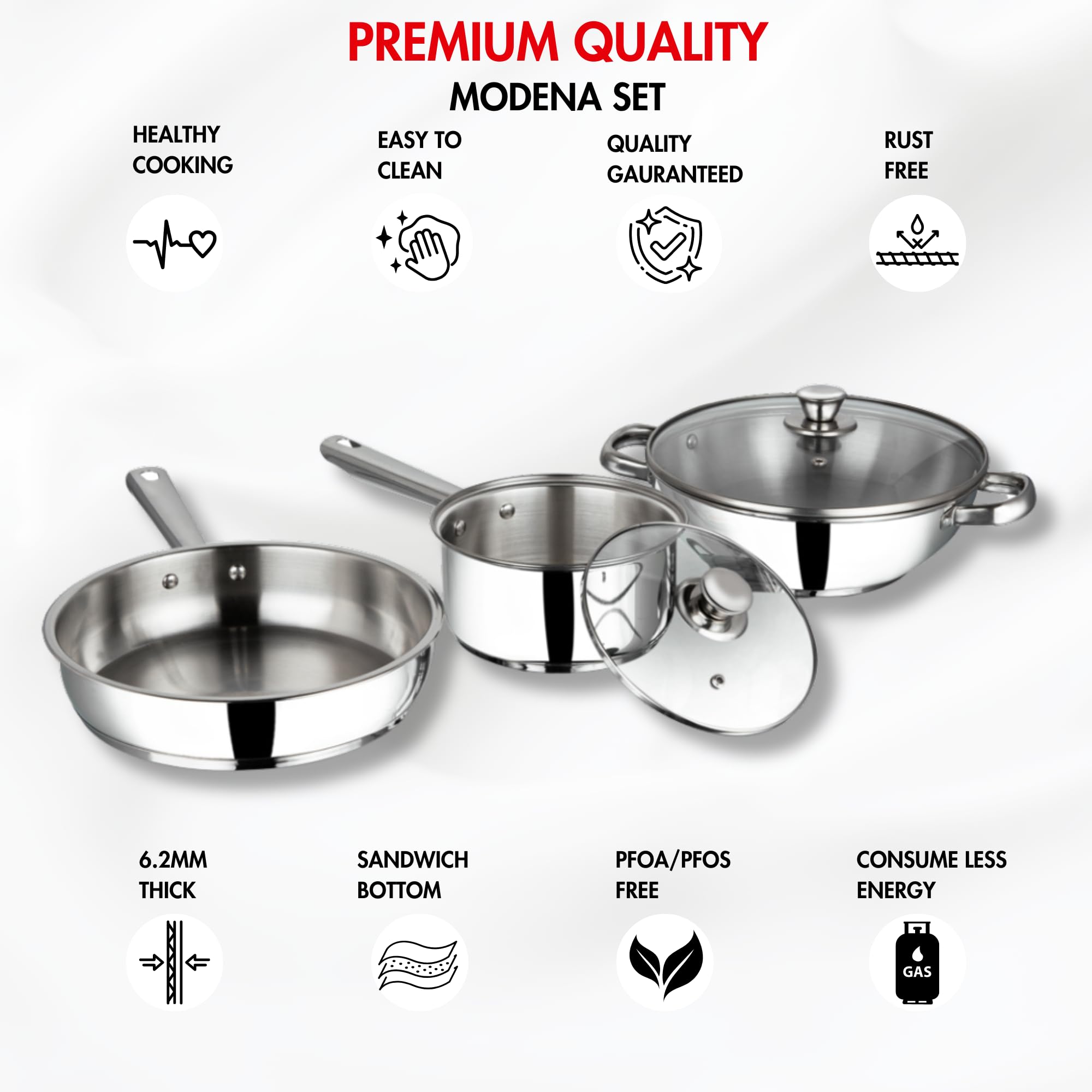 Vinod 3 pc Modena stainless stainless induction based cookware is GO TO set for all your meals whether it is to boil Milk for breakfast in 1.5ltr saucepan that comes with glass lid or cook your favourite lunch in 2.8ltr Kadai with glass lid or simply toss a aloo tikki or eggs for your evening snack in our 24cm frypan.They are made from food grade high quality stainless steel using thicker stainless steel for longer use. To ensure you uniform and faster cooking we have used a layer of aluminium at the bottom. We use a base of stainless steel of Grade AISI 430 grade. This is magnetic and allows you to use your induction cooktop.The mirror finish of the body and the stainless steel layer at the bottom stays bright and looks as good as new after years of use. It also makes the saucepot easy to clean and hassle free. They come with riveted stay cool handles which allow you to work with them effortlessly.