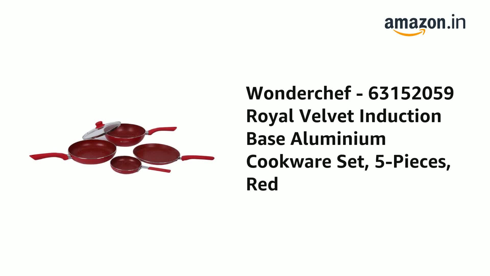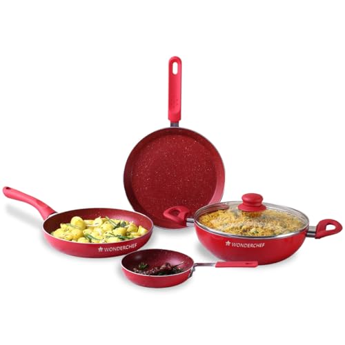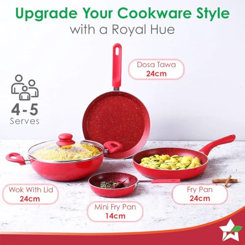 Wonderchef Royal Velvet Non-stick 5-piece Cookware Set (Fry Pan with Lid Wok Dosa Tawa Mini Fry Pan) Induction bottom Soft-touch handles Virgin grade aluminium PFOA/Heavy metals free 3 mm Red