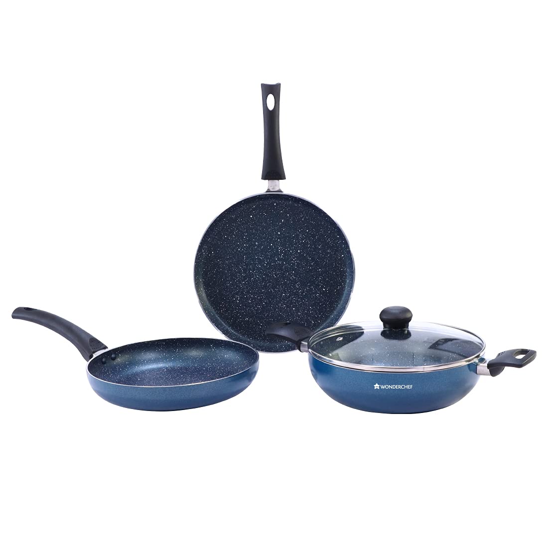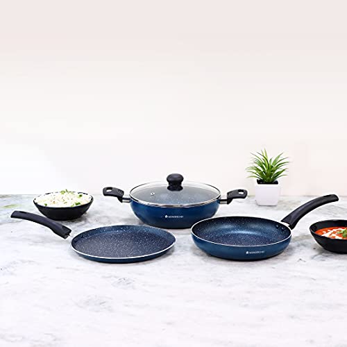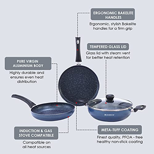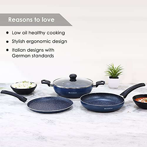 Wonderchef Sigma Non-Stick 4-piece Cookware Set | Kadhai with Lid, Dosa Tawa, Fry Pan | Induction Bottom | Cool Touch Bakelite Handles | Virgin Aluminium | PFOA Free | 2 Years Warranty | Red and Black