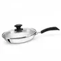 "The Alda Bueno Tri Ply Stainless steel fry pan is a must have cookware in a modern kitchen. It is perfect for making eggs tampering and heating up a small quantity of dry food. It comes with strong cool touch long handle angled perfectly for ease of use. The flared sides help food to cook quickly and let moisture escape for the browning of food without steaming. The see through lid with handle is an added advantage.