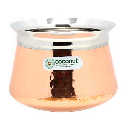 Coconut is a range of innovative and quality products for Home and Kitchen. This Iveo Handi is made from High Quality stainless steel with heavy guage for High Durability. Rust proof and Food Grade steel. Induction and Gas Friendly. Compaq size makes it easy to store in kitchen cupboards. Easy to clean and maintain. When not in use stack the smaller container inside bigger containers saving storage space. Ideal for daily use on your Gas Stove. Energy efficient. Heats evenly and cooks faster. Food will not stick to your pan. This Temple Handi comes with ( Without Handle & Lid).Product content: Coconut Stainless Steel Hammered Copper Braun Handi 1 Unit. Product Dimension - Width 10CM Length - 10Cm Height 8Cm .Capacity 500ML.