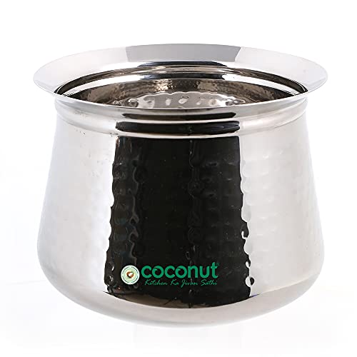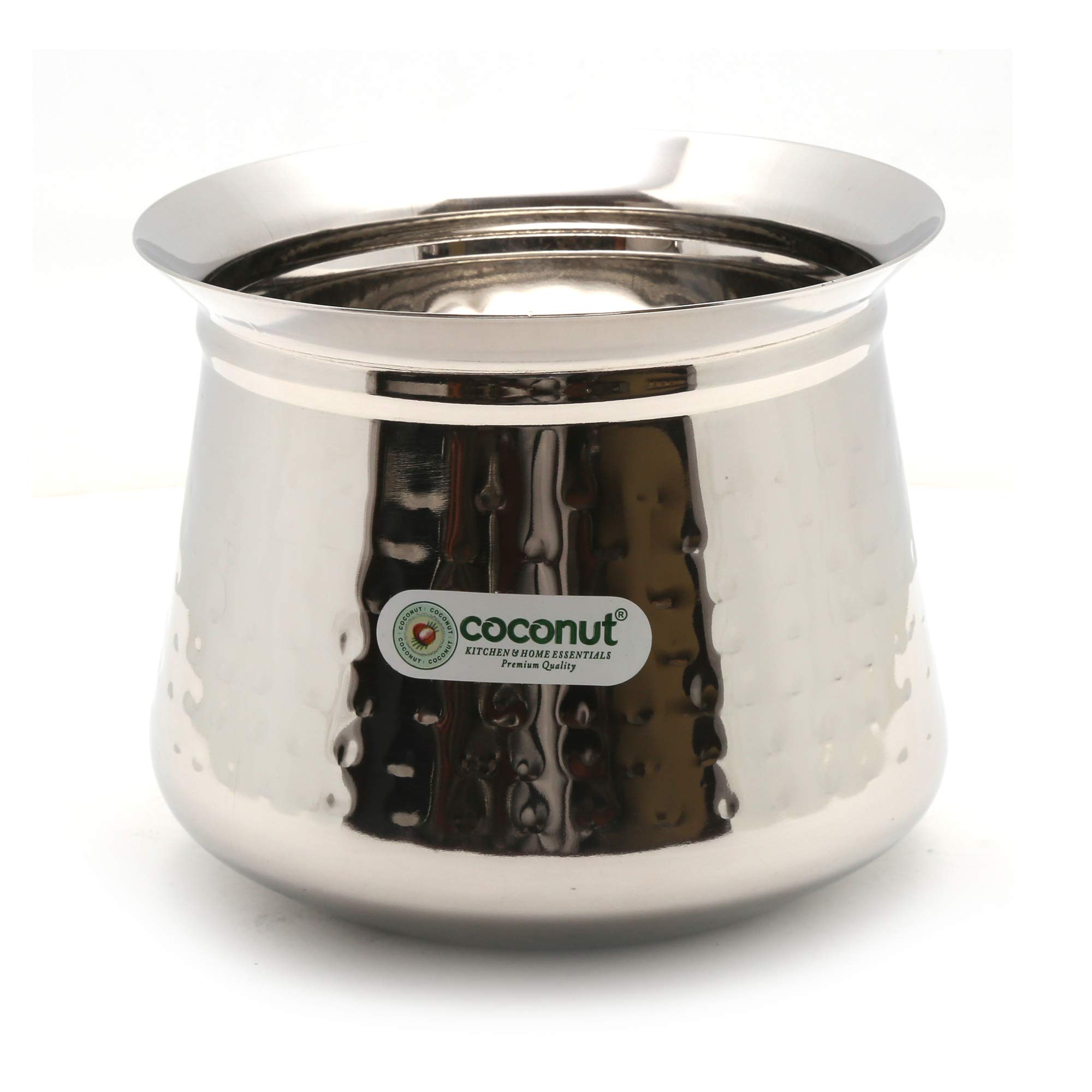 Coconut is a range of innovative and quality products for Home and Kitchen. This Iveo Handi is made from High Quality stainless steel with heavy guage for High Durability. Rust proof and Food Grade steel. Induction and Gas Friendly. Compaq size makes it easy to store in kitchen cupboards. Easy to clean and maintain. When not in use stack the smaller container inside bigger containers saving storage space. Ideal for daily use on your Gas Stove. Energy efficient. Heats evenly and cooks faster. Food will not stick to your pan. This Temple Handi comes with ( Without Handle & Lid). Product content: Coconut Stainless Steel Hammered Radiant Handi 1 Unit. Product Dimension - Iveo Handi No.4 - Width - 15 Cm Length -15 CM Height - 13 Cm. Capacity - 1850Ml .