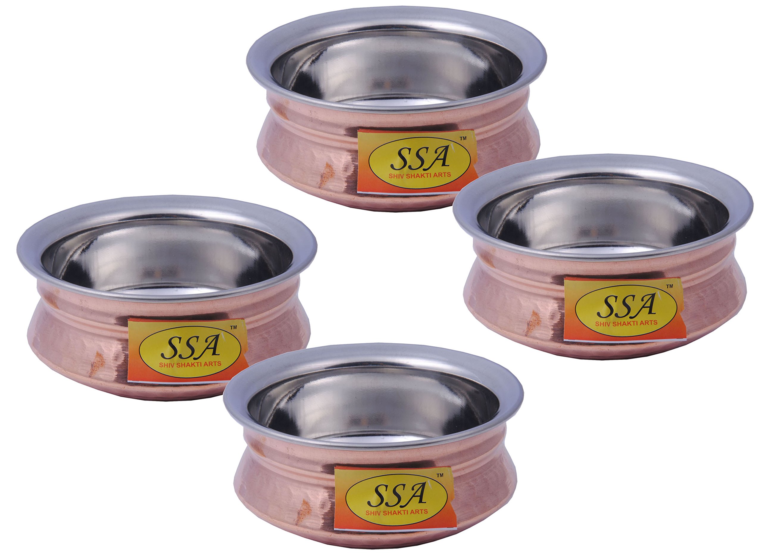 SHIV SHAKTI ARTS Handmade Pure Set of 4 Steel Copper Handi/Bowl/Bhagoni No 1 Hammered Design Bowl/Handi Volume=300 ml for Dinnerware Hotelware Giftware Item for Serving Curry and Dal Purpose