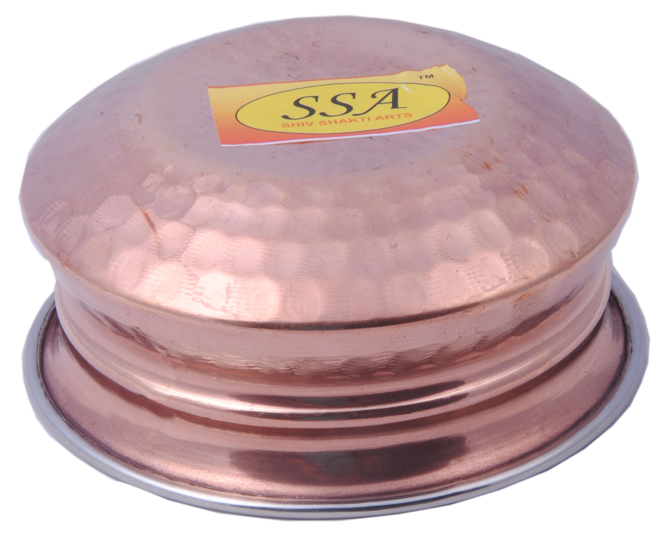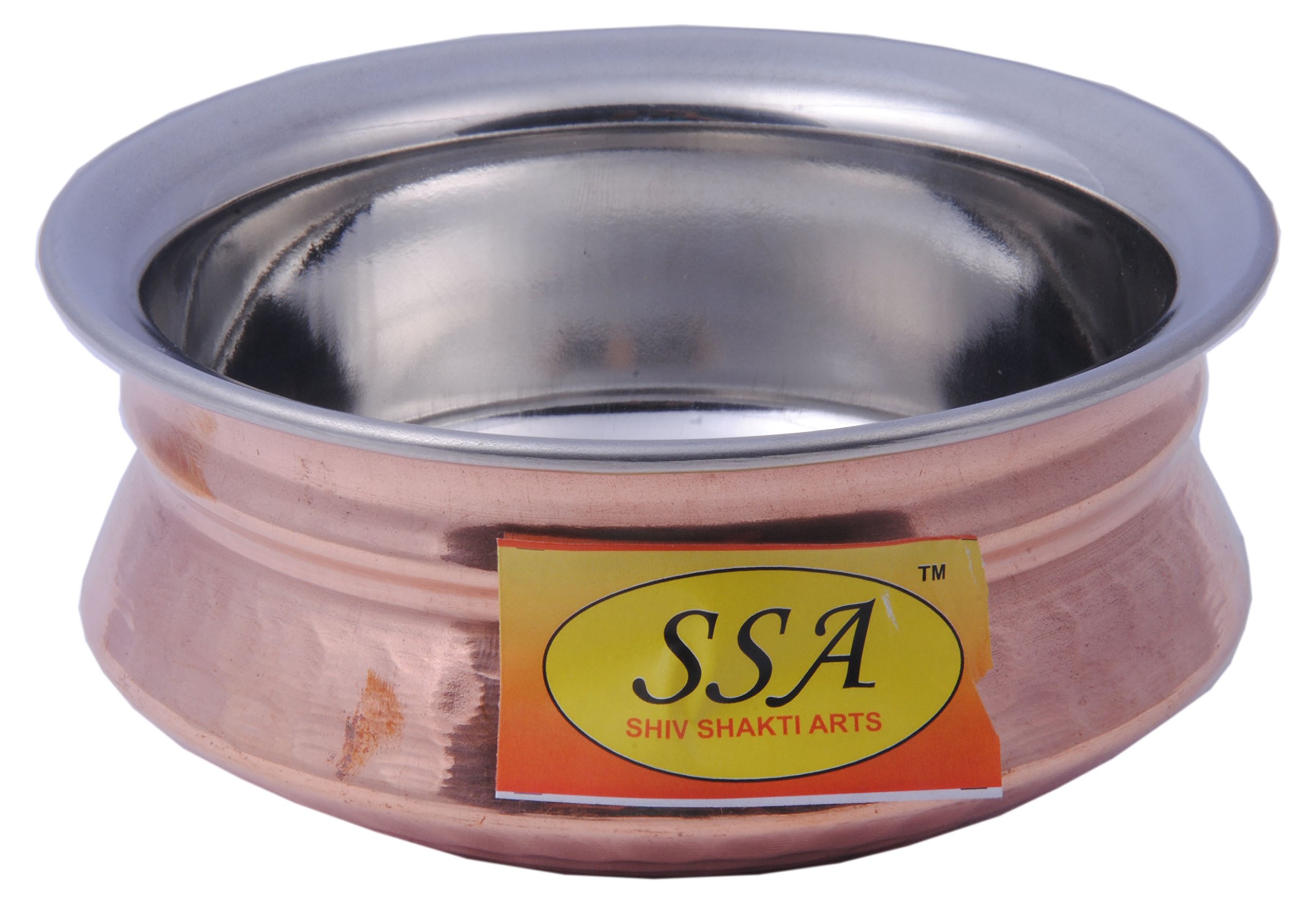 Relish Indian cuisine in Indian style! This is a set of centerpiece serve-ware for Indian food. Serve Indian dishes to your friends and family in this unique and ethnic looking centerpiece serve ware. With this serving utensil set your Indian style dining experience goes several notches up. The material used is food grade. Hammered Copper is used only on the outside of the utensil and does not come in contact with the food. Only the high quality food grade stainless steel is in contact with the food. Two layers of metal with air cushion ensure that the food stays warm much longer. Serving dinner in this dinnerware handi would be unforgettable experience. Care Tips a) Clean your copperware by hand and avoid dishwasher as the detergent can cause oxidation leading to permanent damage. b) Use a solution of equal quantities vinegar or lemon juice and salt diluted with some water at such times but don't use it regularly. c) Avoid scratchy cleaners like steel wool. d) A simple soft cleaning liquid on soap base hot water and a soft washing cloth is best for daily use. e) Use Copper Shining Powder for cleaning the copper utensils. Completely safe and gentle on hands. f) Copper Utensils Tarnish from time to time. This is Normal for an Authentic Copper utensils.