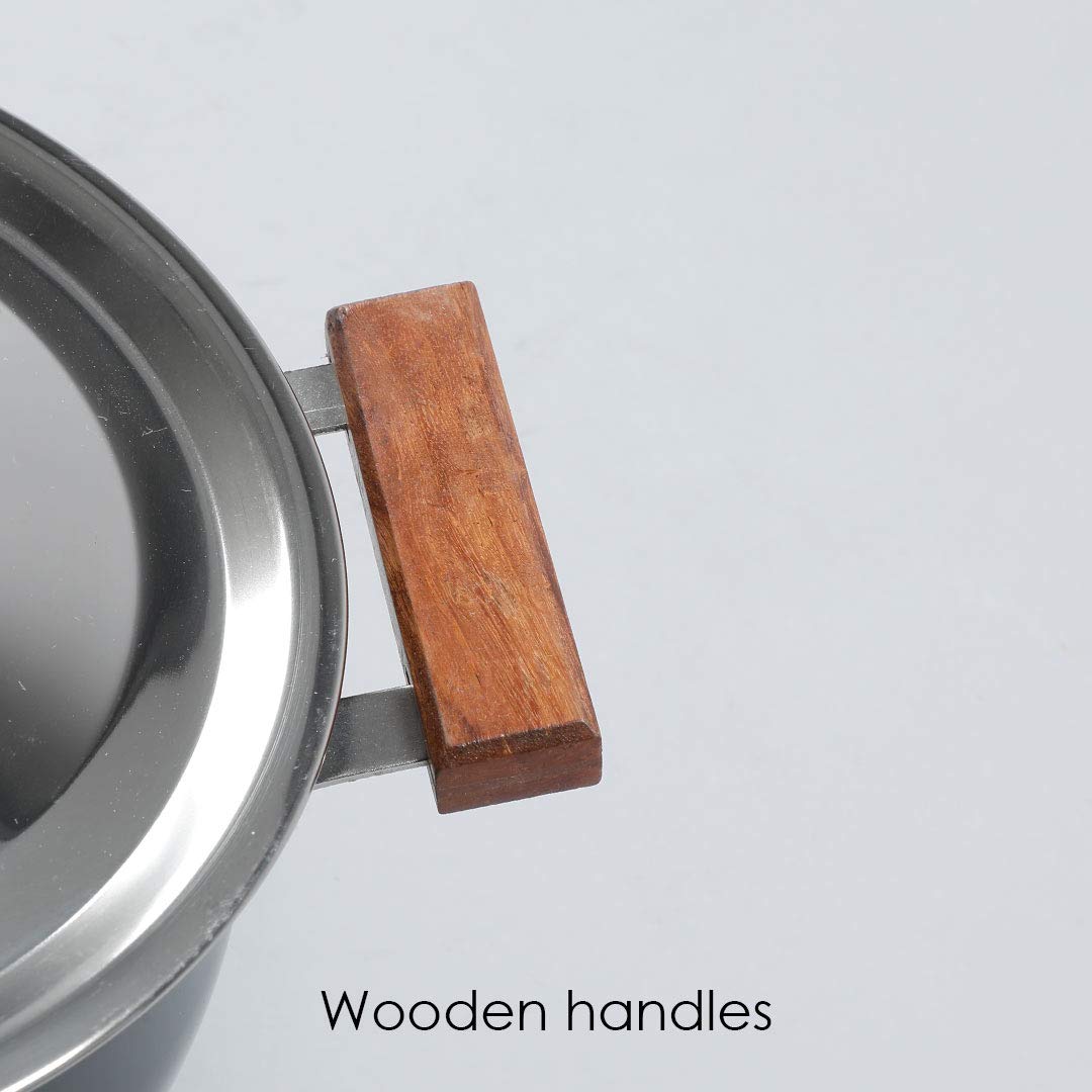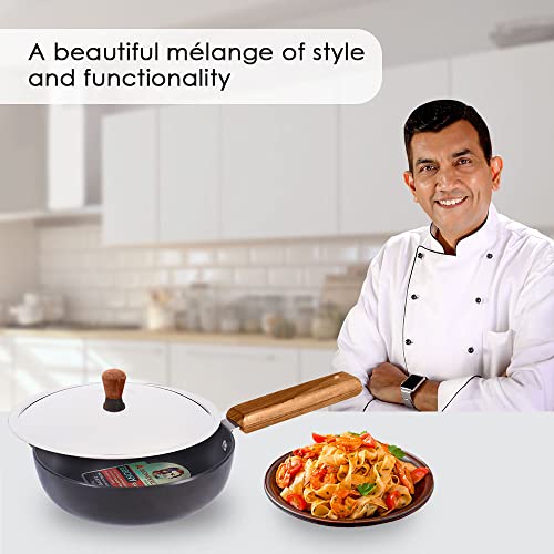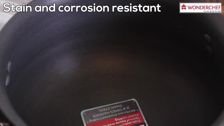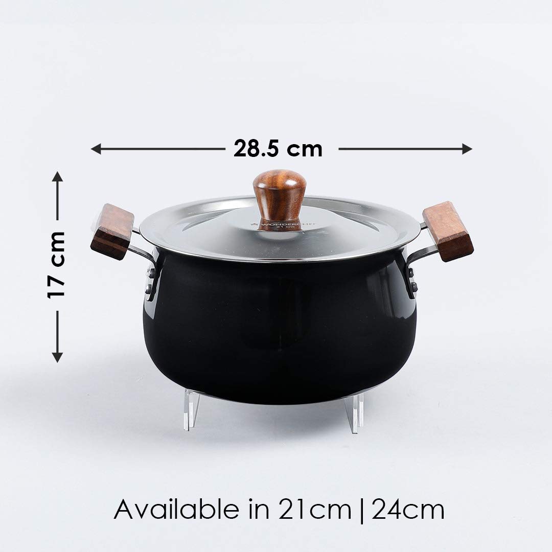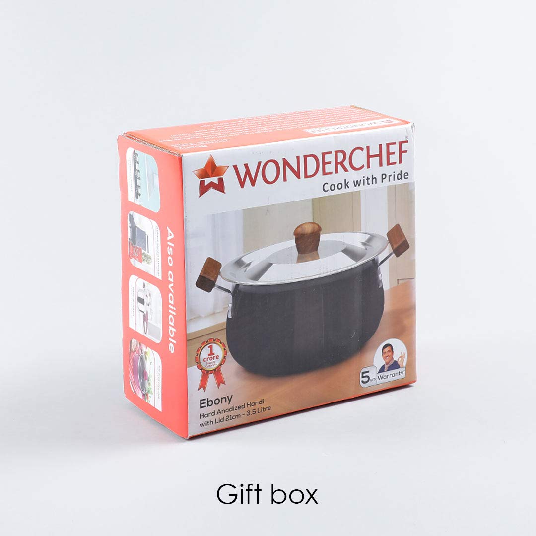Wonderchef Ebony Handi 21 cm Replicate the experience of traditional Indian cooking pots in modern day cookware. The handi is designed specially to retain flavours in the food. Flat base outward curved sides which s at the neck for better heat distribution and retention. The pan surface is hard non-reactive and metal spoon friendly.Pure Aluminum body Made of virgin aluminium using cutting edge technology. 99.9% pure aluminium is a very good conductor of heat enables faster cooking saves energy and time. It never deforms allowing years of healthy cooking. Anodized coatingThe process of anodization makes the wok 2.4 times harder than steel. The non-toxic surface of the pan isstain and corrosion resistant maintaining its elegance after every use.