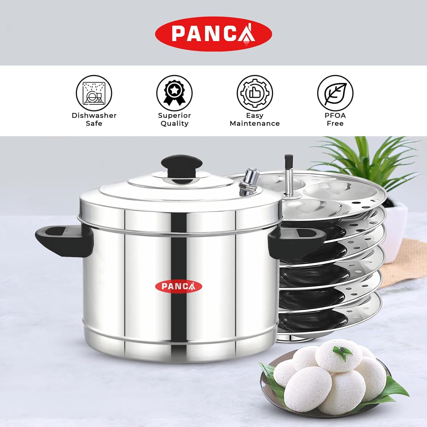 PANCA Idli Maker 6 Plates Stainless Steel 24 Idli Cooker | Induction & Gas Compatible Idly Steamer Pot | South Indian Idli Kadai with Dhokla Patra Steamer, Sambhar Chutni Wada Maker 15L Silver