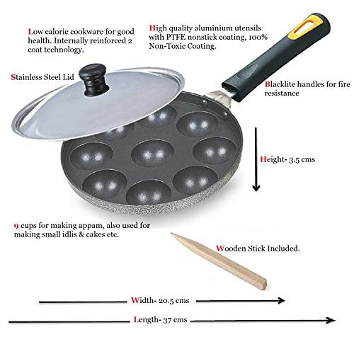 This product has been beautifully designed to add grace to your kitchen experience. Low calorie cookware for good health. Internally reinforced 2 coat technology. 9 cups with stainless steel lid. Also used for making small idlis. 100 percent non toxic. Scratch resistant coating. Easy to clean. Material:- High quality aluminium utensils with ptfe non-stick coating. Backlite handles for fire resistance. Stainless steel lids.