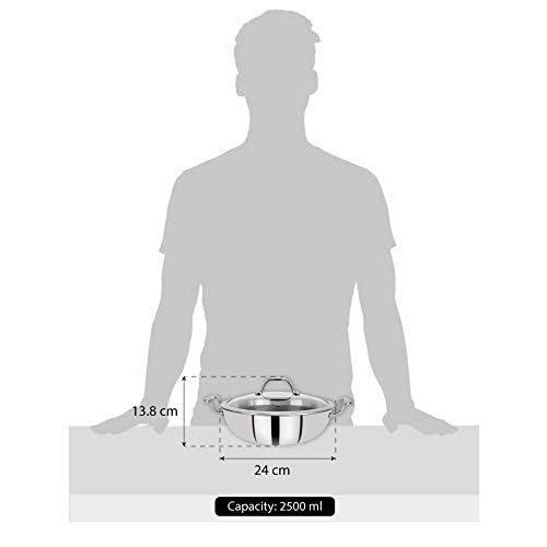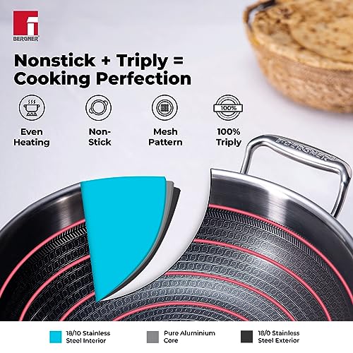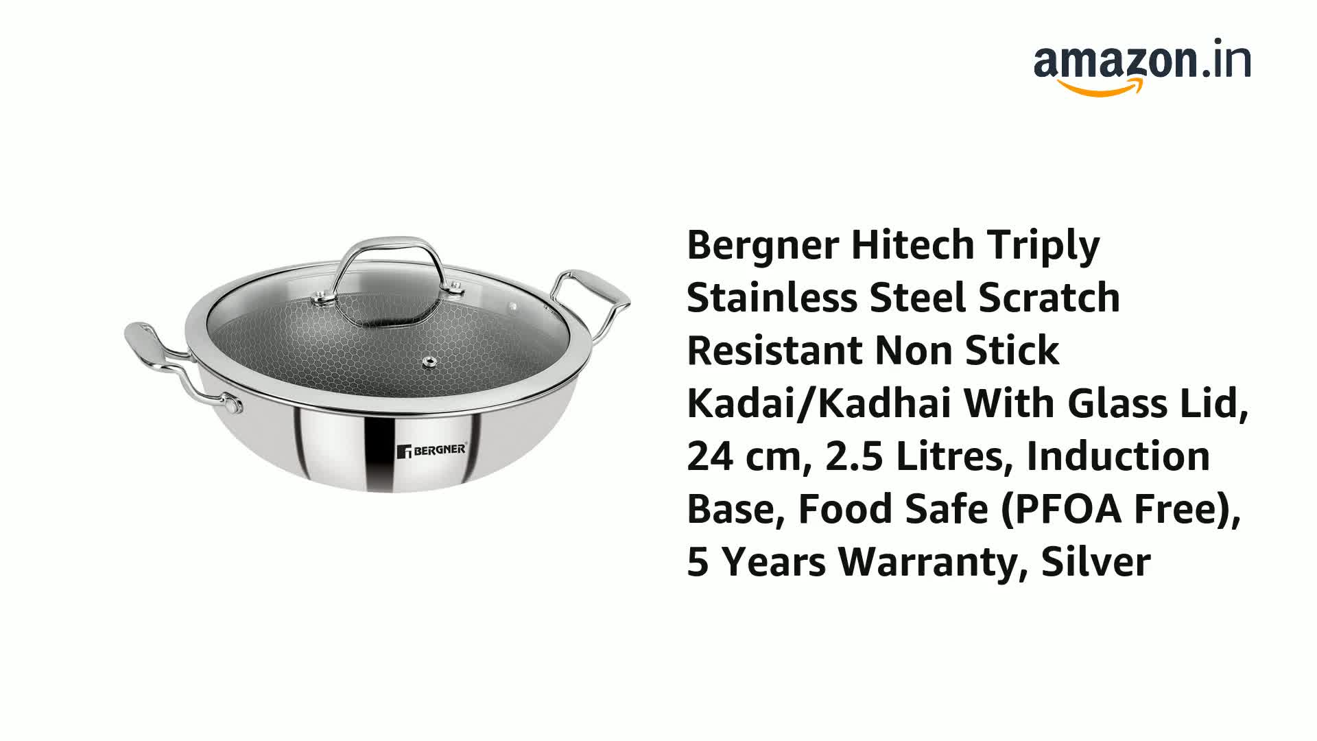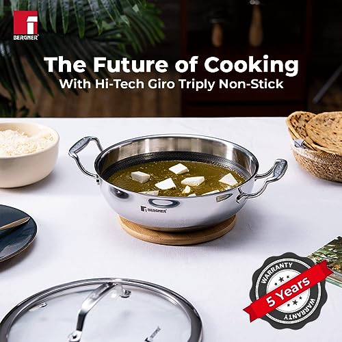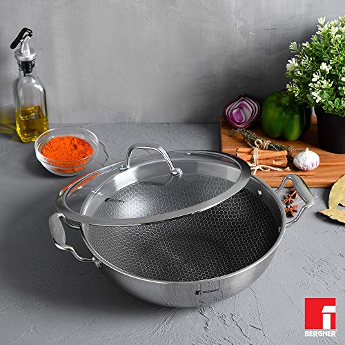 Bergner Hi-Tech TriPly Stainless Steel 24cm (2.5L) Kadai with Glass Lid, Honeycomb Non-Stick Coating, Non-Toxic, Healthy Cooking, Less Oil Use, Durable Handle, Excellent Grip - Induction and Gas Ready