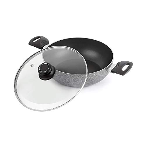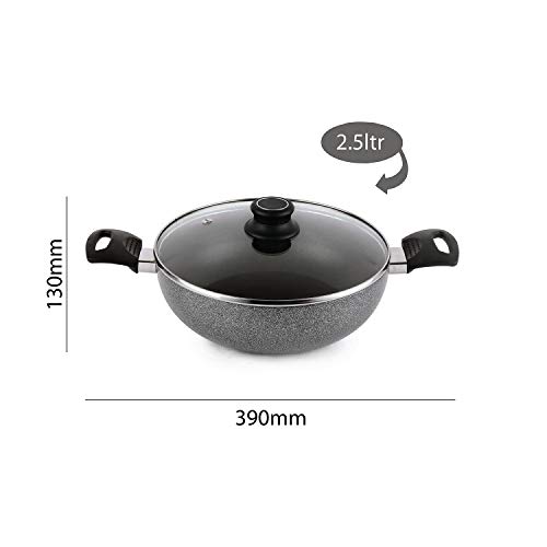Cello Non Stick Hammered Tone Kadhai with Glass Lid 2.5 LTR, Black & Grey, Aluminium