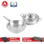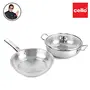 Cello Stainless Steel Fry Pan & Kadai with Glass Lid is a reliable cookware set that brings you hassle-free cooking experience. It contains 1 pc fry pan(22cm) 1 pc kadai (22cm) & 1 pc glass lid that fits kadai & fry pan . Made from 100% food grade stainless steel these are strong and durable. Both the cookwares (kadhai and fry pan) are optimum for cooking frying and serving food for one person as well as a whole family. The kadhais have a induction bottom which is also gass stove compatible and hence brings convenience to your kitchen. The double riveted ear handles of the kadhais provide a firm grip. The kadhais are easy to clean very stylish and will become an eye-catching piece of cookware to have in your kitchen! Cello has been with you serving you accompanying you for generations in each and every space of your home from living room to dinning room bedroom to bathroom. You have made us a part of your family. We want to strengthen this relationship by serving you more. Our products will help you spend great times with your loved ones by making household work an easier and enjoyable experience for you. We as a Cello Group is striving towards introducing a word class lifestyle to every individual for an enduring relationship of trust and commitment.