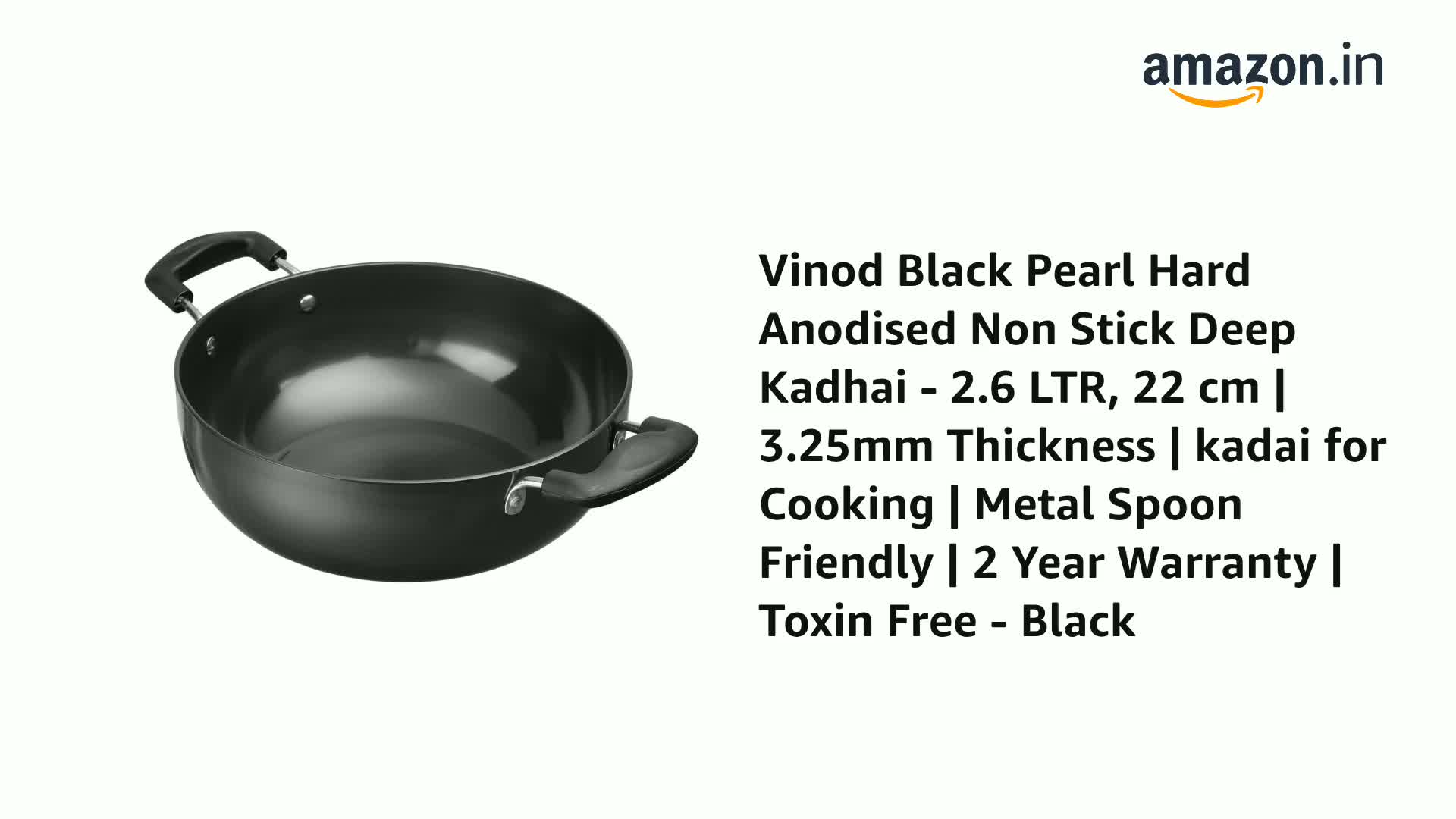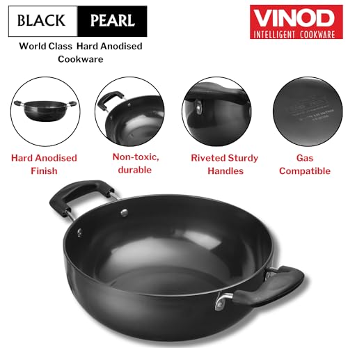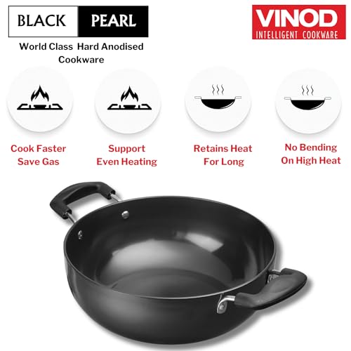 Vinod Black Pearl Hard Anodised Non Stick Deep Kadhai - 2.6 LTR, 22 cm | 3.25mm Thickness | kadai for Cooking | Metal Spoon Friendly | 2 Year Warranty | Toxin Free - Black