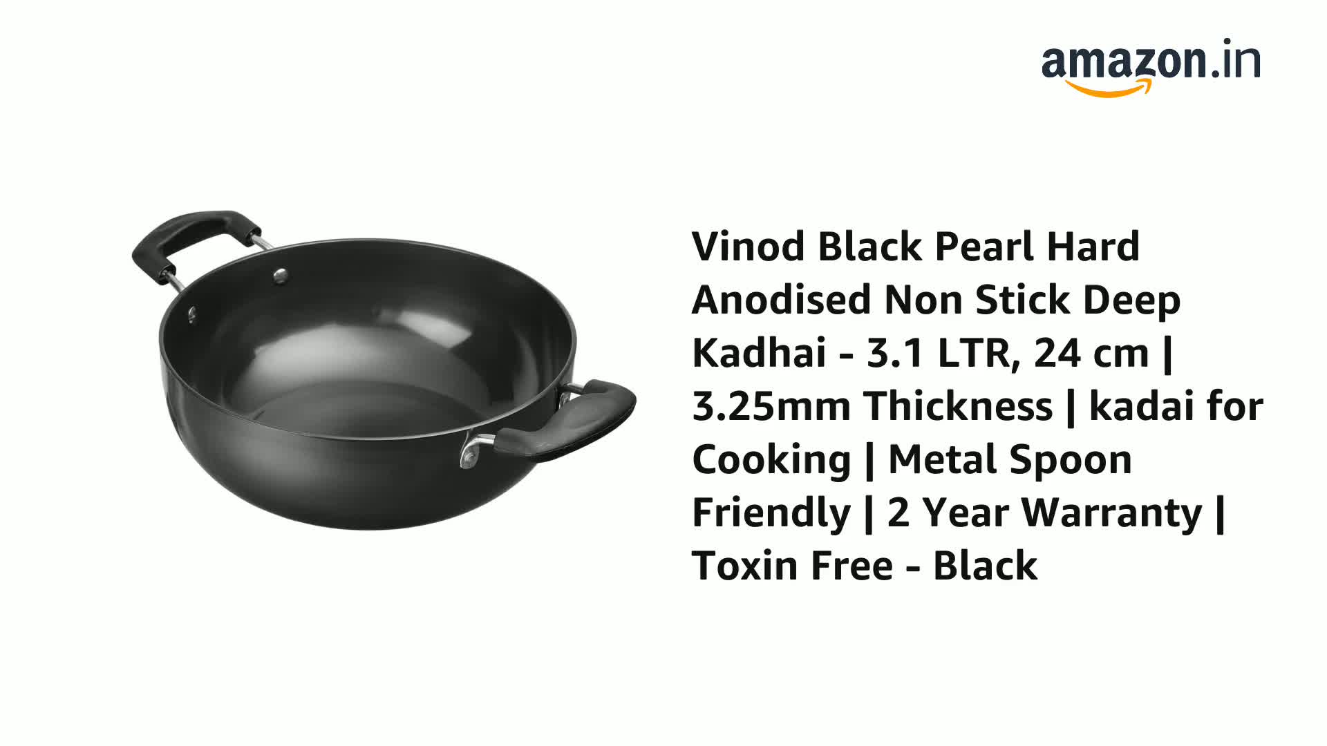 Vinod Black Pearl Hard Anodised Non Stick Deep Kadhai - 3.1 LTR, 24 cm | 3.25mm Thickness | kadai for Cooking | Metal Spoon Friendly | 2 Year Warranty | Toxin Free - Black