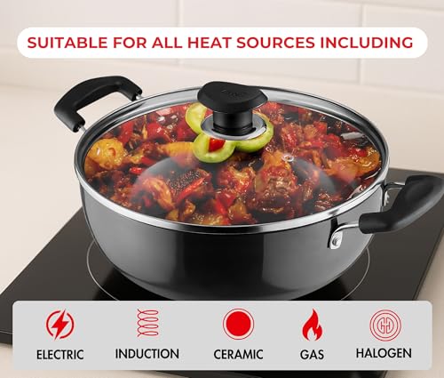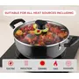 Vinod Hard Anodized Cookware is designed with thick body which helps even heat distribution and makes the cookware long lasting and durable. Itâs new improved coating makes the cookware durable and poses no harm to food. The beautiful durable black finish which is hard anodised has two benefits i.e. it makes the cookware absorb heat faster making it more energy efficient and the cookware stays looking the same for years. This cookware has sturdy riveted handles for better grip and it comes with tempered glass lid which allows you to see through the cooking process. This is both gas stove and induction compatible.
