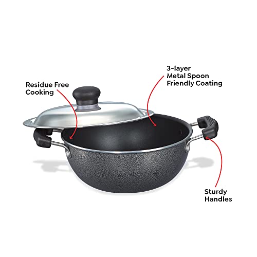 • Material: Non-stick Aluminium; Size: Kadai With Lid (20cm 2.2 Liters); Base type: Non Induction Base; Base thickness (in mm): 2.7; Included components: 1 Non-stick Flat Base Kadai With Lid; Colour: Black