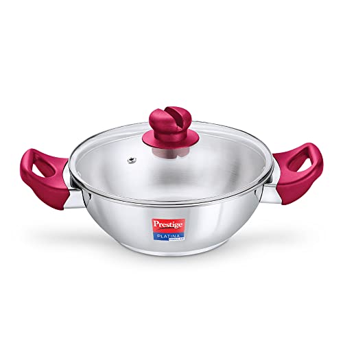 1 x Prestige Platina Popular Stainless Steel Gas and Induction Compatible Kadai with Glass Lid 220 mm