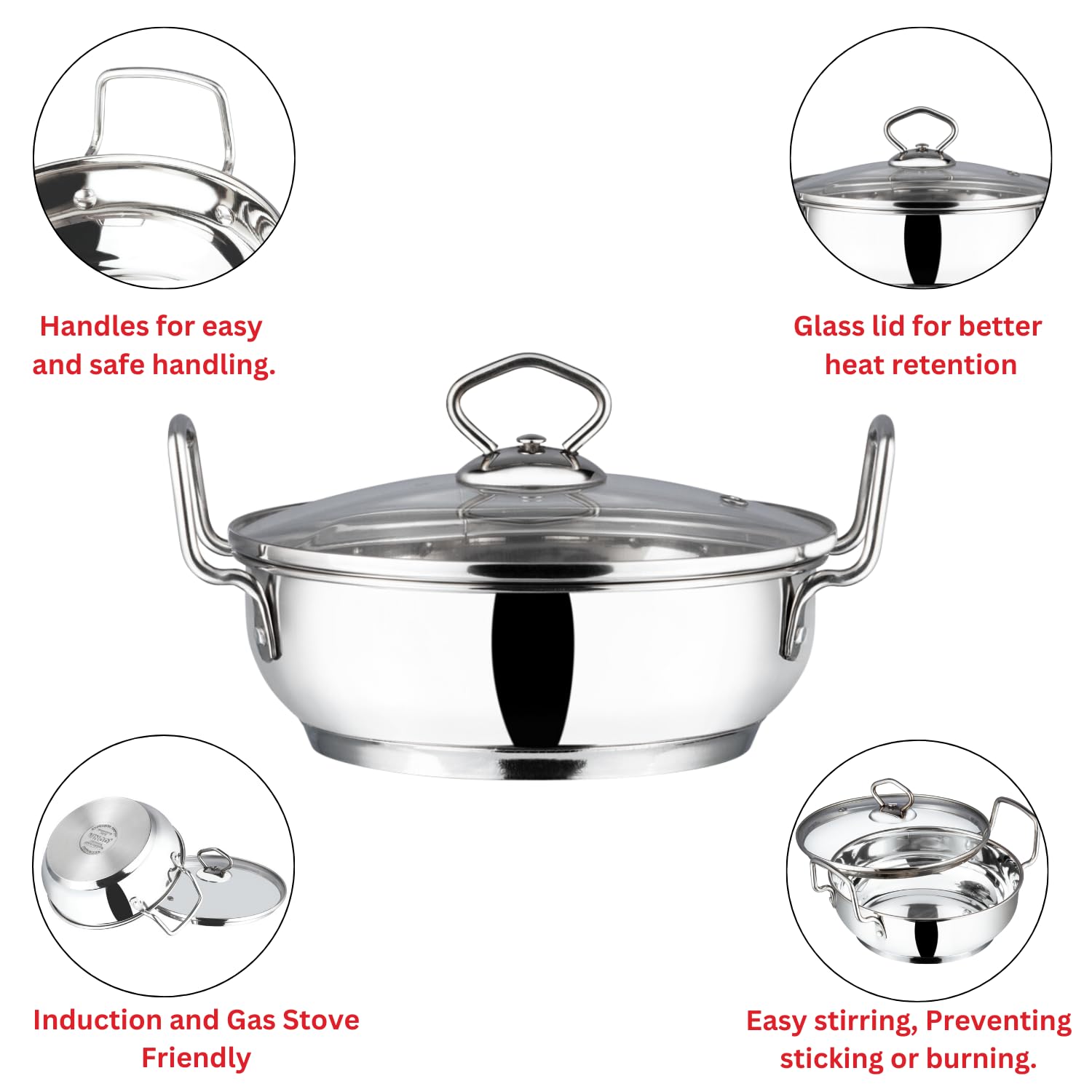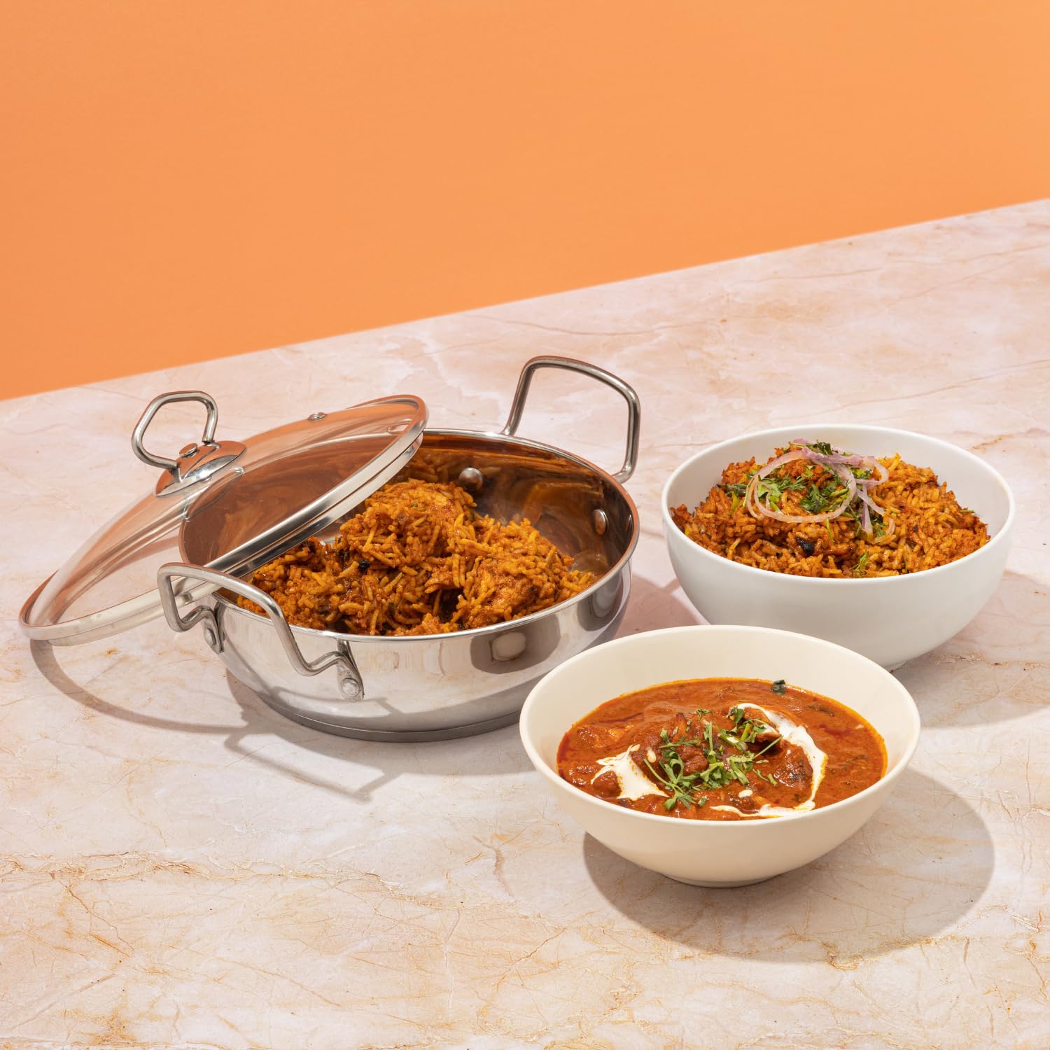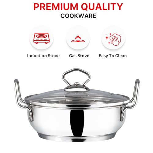 Fry your favourite fries or prepare your meat. Boil your vegetables or cook your sauce. This multi purpose induction friendly kadai is a must have in your kitchen. Comes with a tempered glass lid. Now cook and serve in it too.