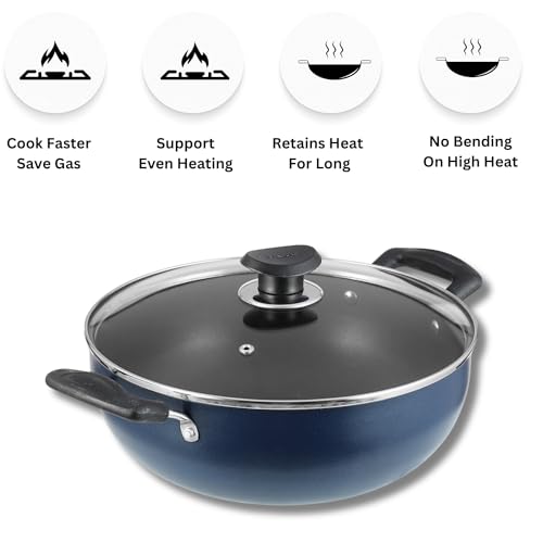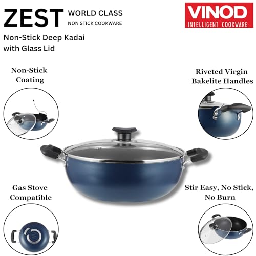HomeKitchenTraditional CookwareKadhaiVinod Zest Aluminium Non Stick Deep Kadhai with Glass Lid - 1.4 Litre, 18cm | 3 Layer Ceramic Coating | 3 mm Thick | Metal Spoon Friendly | Gas Base, Toxin Free - 1 Year Warranty
