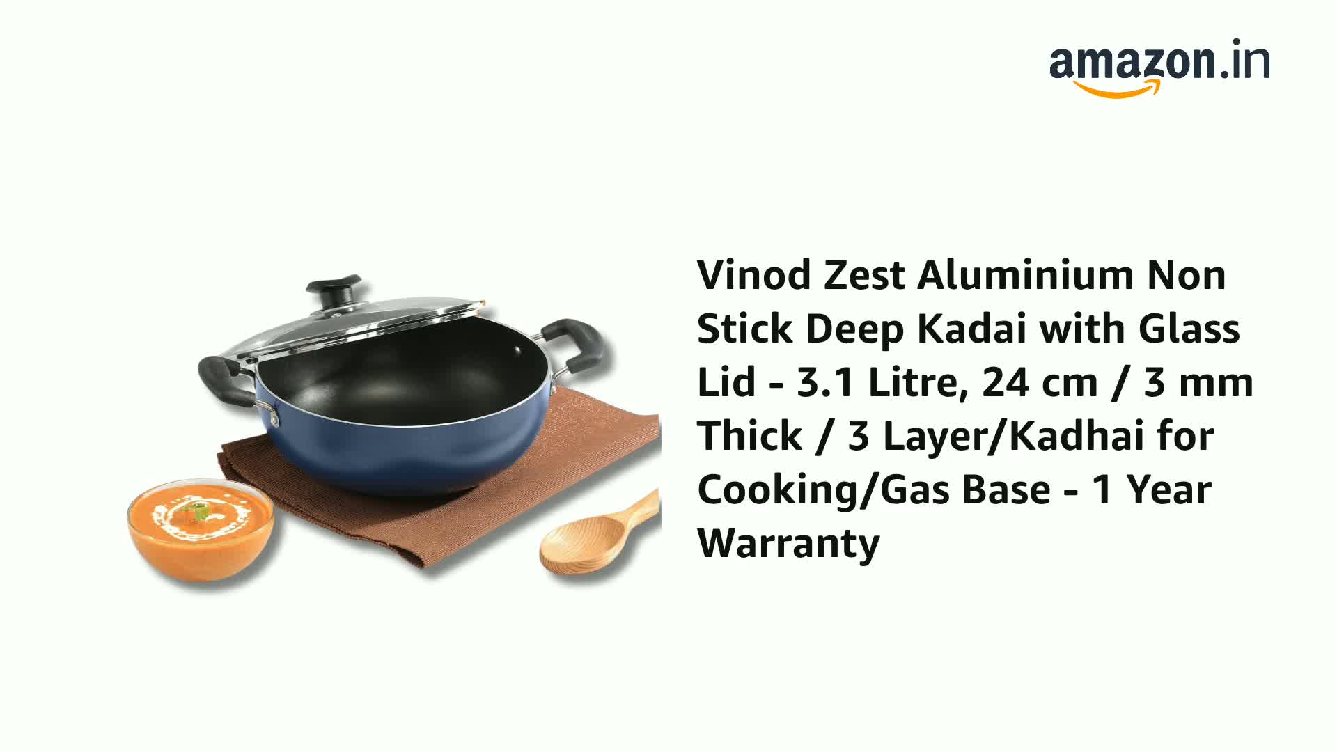 This Vinod non stick deep kadai with glass lid has a thick aluminium which ensures faster and burn free cooking. It is must have in your kitchen. Deep spacious kadai for comfortable and mess-free cooking. You can make your food healthier with the help of this non-stick kadai as it consumes less oil. It comes with glass lid which makes you cook faster and keeps your food warm. The lid also has a steam release vent. This deep kadai is equipped with heat resistant riveted handles which allow for easy handling in the kitchen without coming off loose over time. The deep kadai is designed for modern kitchens and appliances. It is both gas stove and induction compatible. It is ideal for sauteing vegetables cooking meat and gravy and deep-frying . It is free from PFOA heavy metals and harmful chemicals. So much better than cheap coatings that peel off and lose effectiveness within a few months of use. The non stick coating helps prevent cooked food from adhering to the kadai; instead food effortlessly transfers to a platter or dinner plate for gracious serving. It comes with a 12 months warranty; terms and conditions apply.