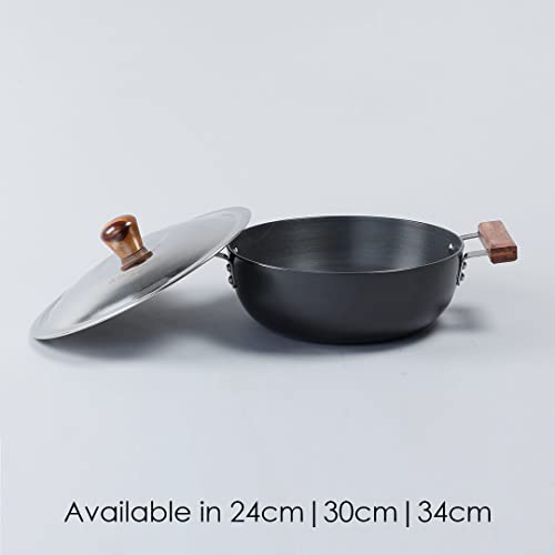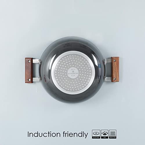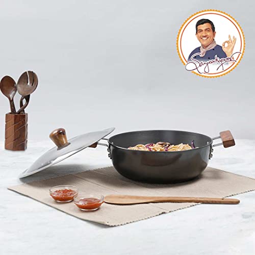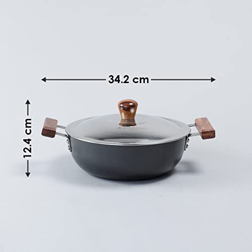 Stunning grey colour with wooden handles give a sophisticated look to your kitchen. The process of anodizing makes the aluminium harder and non-reactive. This ensures years of hassle-free use faster cooking and even heat distribution. 60 microns anodized coating makes it 2.4 times harder than steel. Stain and corrosion resistant easy to clean and maintain. Suitable for use on gass electric and glass stove tops.