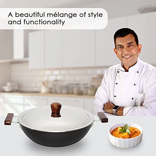 Wonderchef Ebony Aluminium Hard Anodized Deep Kadhai/Kadai with Lid - 30 cm, 6 Litre | Ideal for Sauteeing Veggies, Dal and Curries | Black