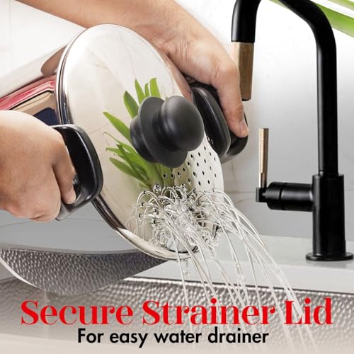 • Included lid with builtin straining holes with heat resistant handles that can be easily twisted and locks to drain excess water from the pot.