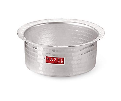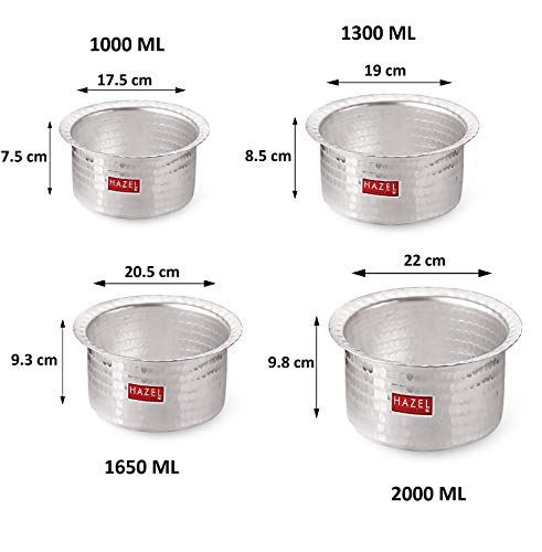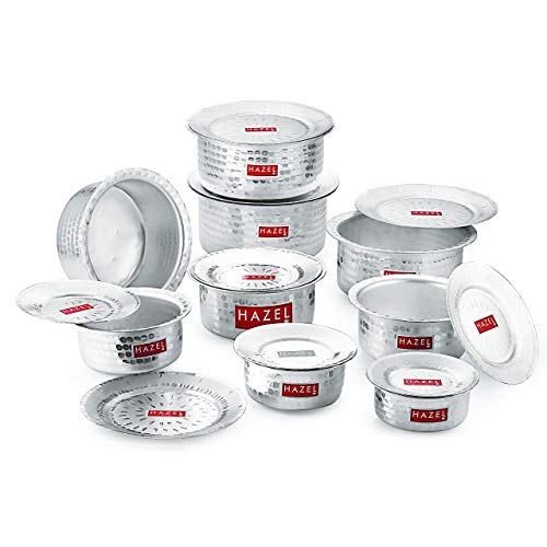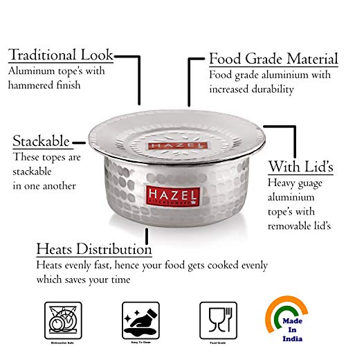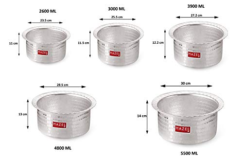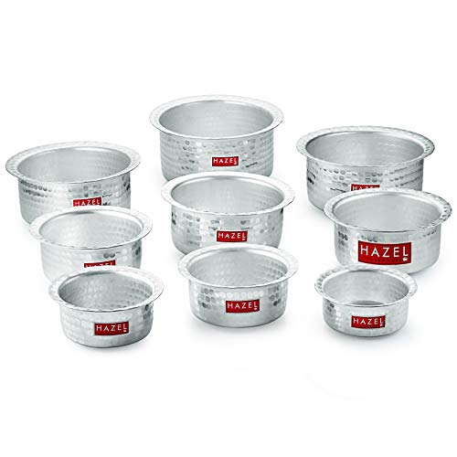 HAZEL Aluminium Hammered Finish Tope Patila With Lid Set of 9Suitable for all heat sources even heat distribution so food does not burn excellent quality easy to clean and hygienic stainless steel. It is made from the finest Aluminium and is ideal for stir-frying sauteing and even everyday cooking. Excellent for curries and vegetable dishes. It's a must have for every Indian kitchen. Cook indian dishes for your friends and family in this unique and ethnic looking Cookware Utensil. With this cookware utensil your indian style cookware experience goes several notches up. This kadhai is made of stainless steel and this kadhai has an intricate traditional hammered design to provide it a royal look. It is perfect for cooking dishes. This cookware utensil is of classy finish and gives an elegant look to kitchen decor. The superb design of the cookware makes it a great addition to your antique cookware collection.This set is made from high quality Aluminium making it exclusive and durable. Dimension : 17.7 x 17.7 x 7.5 cm (LxBxH) Diameter : 17.7 cm Weight : 330 gm Capacity : 1000 ML. Dimension : 19 x 19 x 8.5 cm (LxBxH) Diameter : 19 cm Weight : 380 gm Capacity : 1300 ML. Dimension : 20.5 x 20.5 x 9.3 cm (LxBxH) Diameter : 20.5 cm Weight : 440 gm Capacity : 1650 ML. Dimension : 22 x 22 x 9.8 cm (LxBxH) Diameter : 22 cm Weight : 540 gm Capacity : 2000 ML. Dimension : 23.5 x 23.5 x 11 cm (LxBxH) Diameter : 23.5 cm Weight : 620 gm Capacity : 2600 ML. Dimension : 25.5 x 25.5 x 11.5 cm (LxBxH) Diameter : 25.5 cm Weight : 670 gm Capacity : 3000 ML. Dimension : 27.2 x 27.2 x 12.2 cm (LxBxH) Diameter : 27.2 cm Weight : 720 gm Capacity : 3900 ML. Dimension : 28.5 x 28.5 x 13 cm (LxBxH) Diameter : 28.5 cm Weight : 840 gm Capacity : 4800 ML. Dimension : 30 x 30 x 14 cm (LxBxH) Diameter : 30 cm Weight : 1030 gm Capacity : 5500 ML.