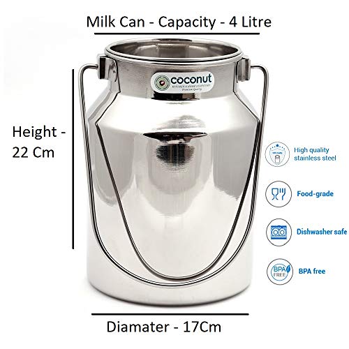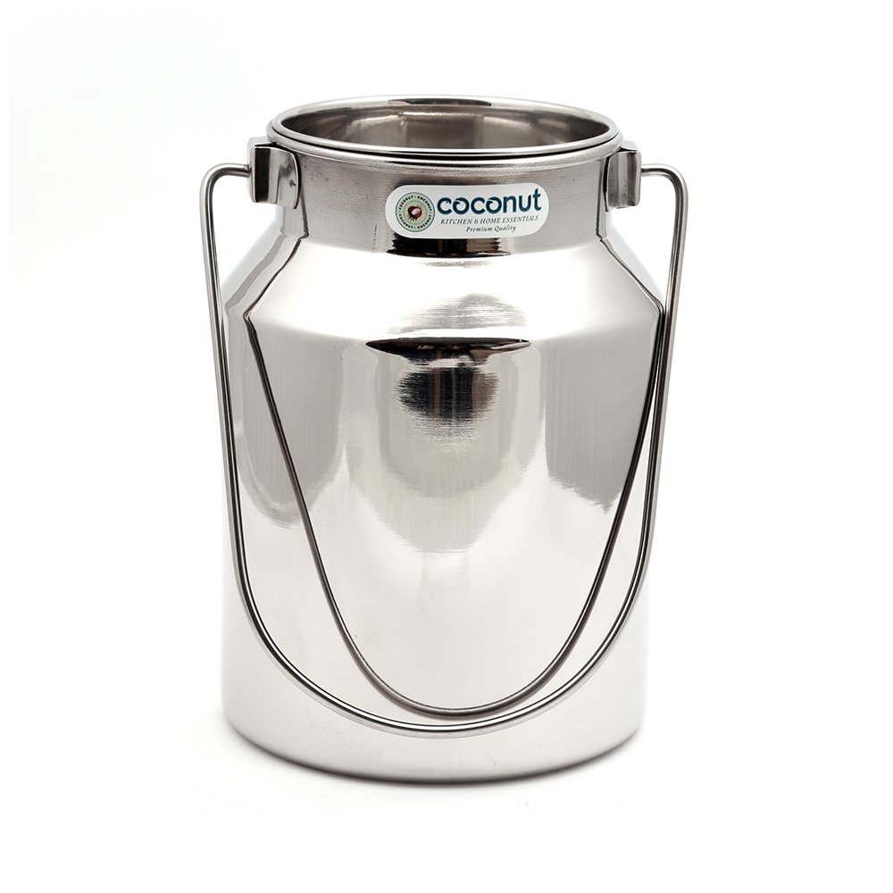 "Coconut brand is a range of ultra premium quality stainless steel Stainless Steel is against any kinds of manufacturing defects. Coconut S.S. Milk Pot 4 ltr (approx.) is a milk storing container which is made of ultra premium quality heavy guage stainless steel . The milk pot is made of jointless body which makes the body free from welds ensuring you no leakage of milk from the body in the long run . The pot has a simple sober plain glossy finish to make it more appealing . It is made from rust proof stainless steel which ensures your milk doesn't split by reacting with the container remains hygenic the pot comes with an inner lid system which reduces the spillage of milk . The handle provided at the neck of the body is welded strongly to the body which makes sure long life of the pot . The neck of the pot is broad enough to provide easy cleaning of the product.Daily utility long life easy to use easy to clean ."