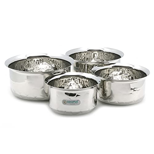 Coconut is a range of innovative and quality products for home and kitchen utilities. These Smart tope set is made from premium quality stainless steel material. These topes are durable and made from 100% food grade stainless steel. These topes are available in 4 different sizes and it is stackable into one other which saves your space in kitchen. It is easy to clean and maintain Dishwasher safe.Product content : stainless steel Smart tope set of 4 units Product Daimension- Smart Tope No 1 - Width - 15.5 Cm & Height - 8.5 Cm. Smart Tope No 2 - Width - 17 cm & Height - 9 Cm. Smart Tope No 3 - Width 19 Cm & Height - 10 Cm. Smart Tope No 4 - Width 21 Cm & Height 10 Cm . Product Capacity - Smart Tope No -1 1000 ml Smart Tope No- 2 1300 ml Smart Tope No -3 1800 ml Smart Tope No 4 -2300 ml.