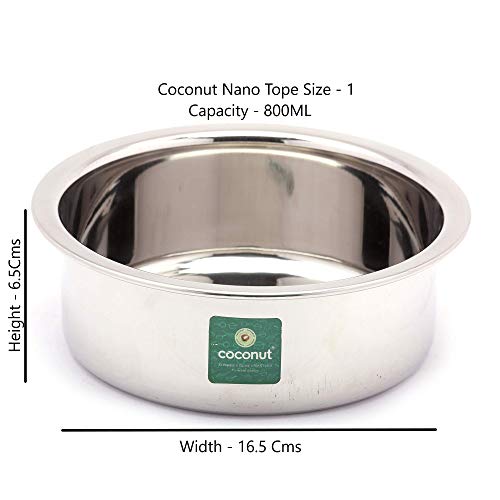 Coconut is a range of innovative and Quality products for Home and Kitchen Utilities. These Nano Tope set is made from Premium Quality Stainless Steel material. These Topes are Durable and made from 100% Food Grade stainless Steel. It Is easy to clean and maintain Dishwasher Safe.Product Content : Stainless Steel Nano Tope - 1 Unit Dimension & Capacity :- (Size 1 Width 16.5 Cms & Height 6.5 Cms Capacity 800ML).