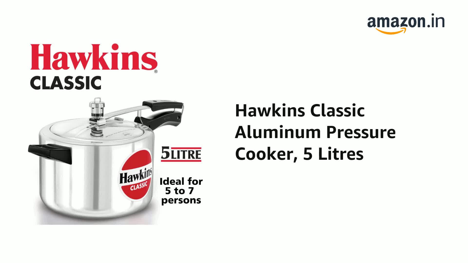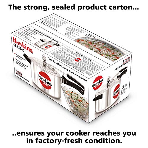 Each pressure cooker made by Hawkins features an inside fitting lid. This design is inherently safer than conventional pressure cookers. To open any Hawkins cooker, you have to first lower the lid slightly into the body of the cooker; and that cannot be done until the steam pressure inside the cooker falls to a safe level. Thus Hawkins pressure cookers are pressure-locked for safety - like a jetliner door!