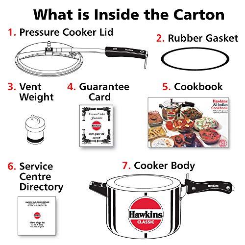 1 - Cooker Body 1 - Cooker Lid 1 - Vent Weight 1 - Rubber Gasket 1 - Guarantee Card 1 - Cookbook 1 - Service Centre Directory